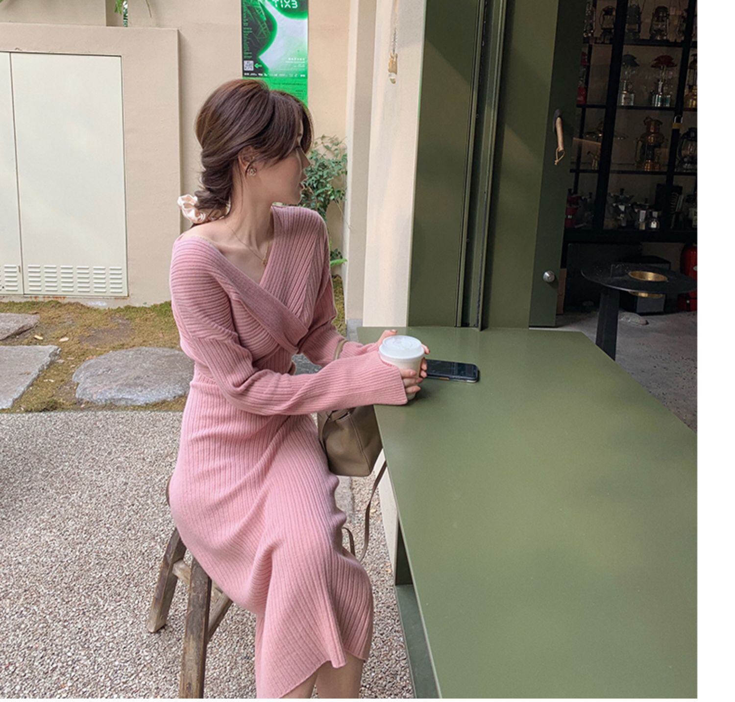 オーバーコート付きロングオーバーザニーセータースカートデザインセンスクロスVネックスリムスリミングニットワンピース女性秋 オータム 秋物 yingd93876866830