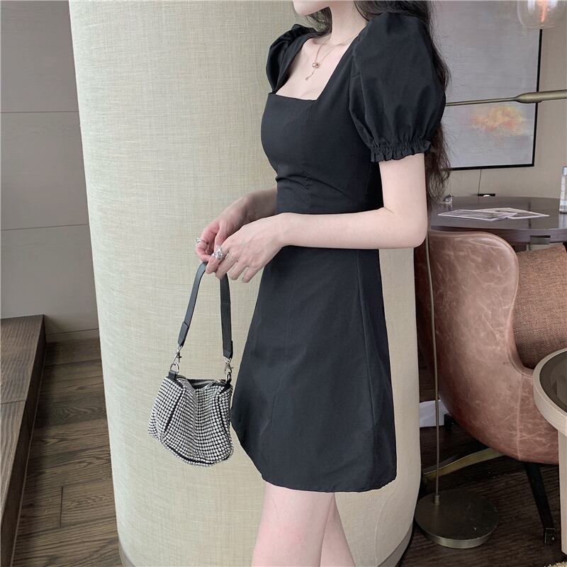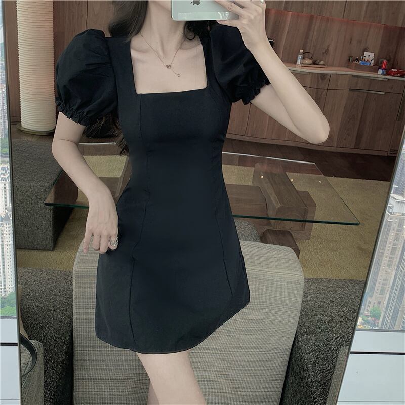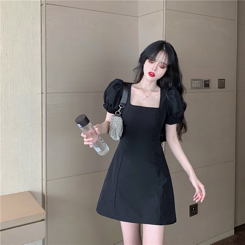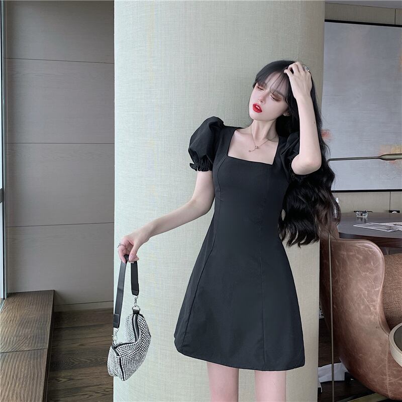 フランスのレトロな人気のヘップバーンスタイルのリトルブラックドレスウエストウエストは細い気質のAラインスカートスクエアネックパフスリーブドレス女性でした スクウェア yingd4672765726