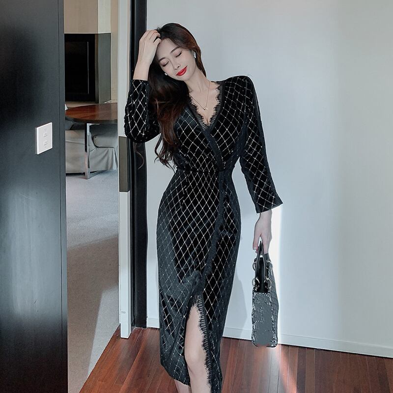 フランスのレトロなヘップバーンスタイルのリトルブラックドレスのウエストは細く、気質のVネックレースステッチベルベットドレス女性の秋と冬 オータム 秋物 ウィンター 冬物 yingd75410977352