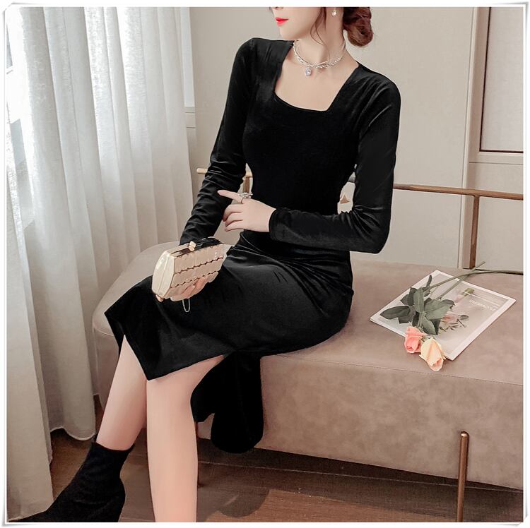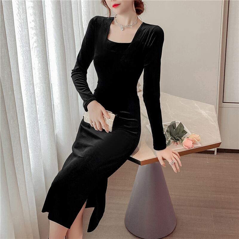 フレンチレトロスクエアカラーライトマチュアスタイルセクシースプリットロングスカート慎重にマシンオープンバック長袖ベルベットドレス女性秋冬 オータム 秋物 ウィンター 冬物 スクウェア yingd71501964676