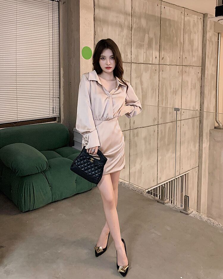 2021年秋新作風冷風レディース高級感軽高級サテンウエストセクシーヒップバッグシャツワンピース オータム 秋物 yingd4118210064