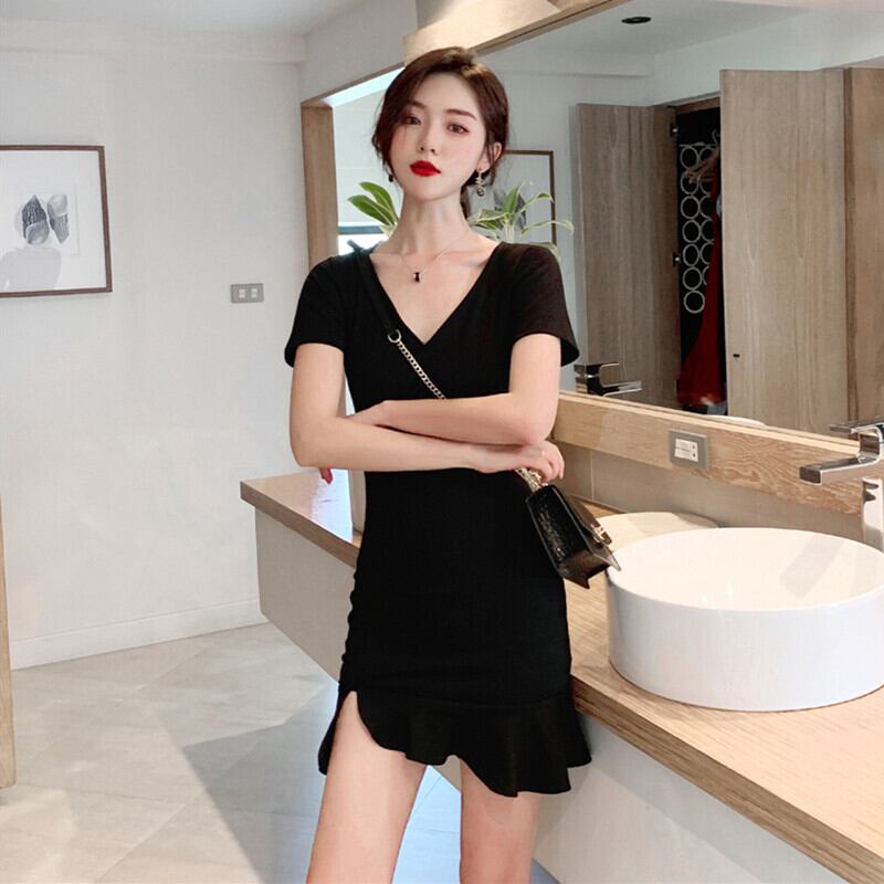 フランスのレトロなヘップバーンリトルブラックドレス2020夏の新しい気質Vネックセクシーなフィッシュテールバッグヒップドレス女性 サマー 夏物 yingd13533989241