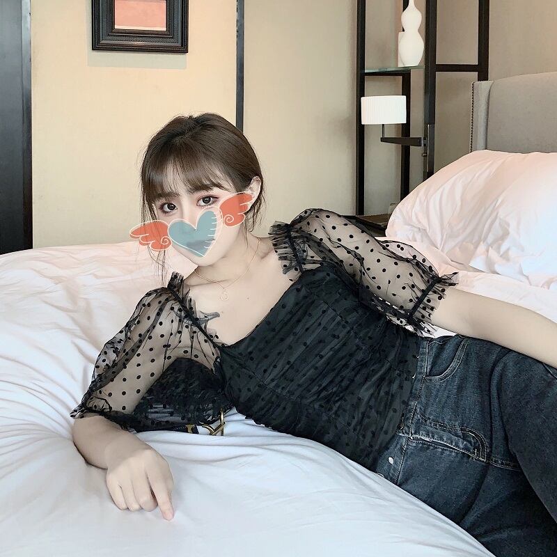 2020年夏の新しいレトロな香港風味のセクシーなワンショルダートップレディースパフスリーブ水玉メッシュシャツデザインセンス レッド サマー 夏物 yingd44304499641