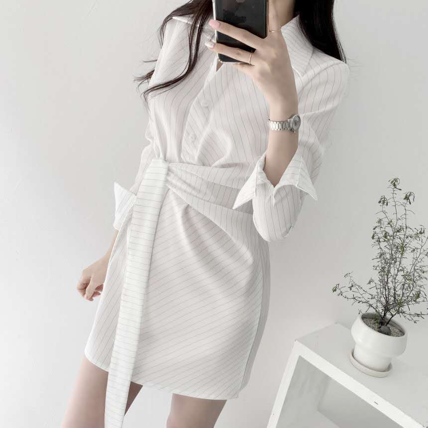 2020年秋新作女性デザインスカートライトマチュア風イレギュラーウエスト長袖ストライプシャツワンピース ロング オータム 秋物 yingd12453401448