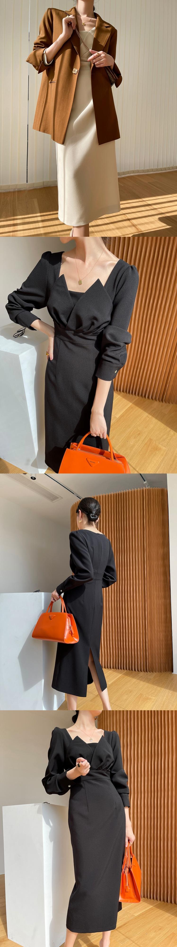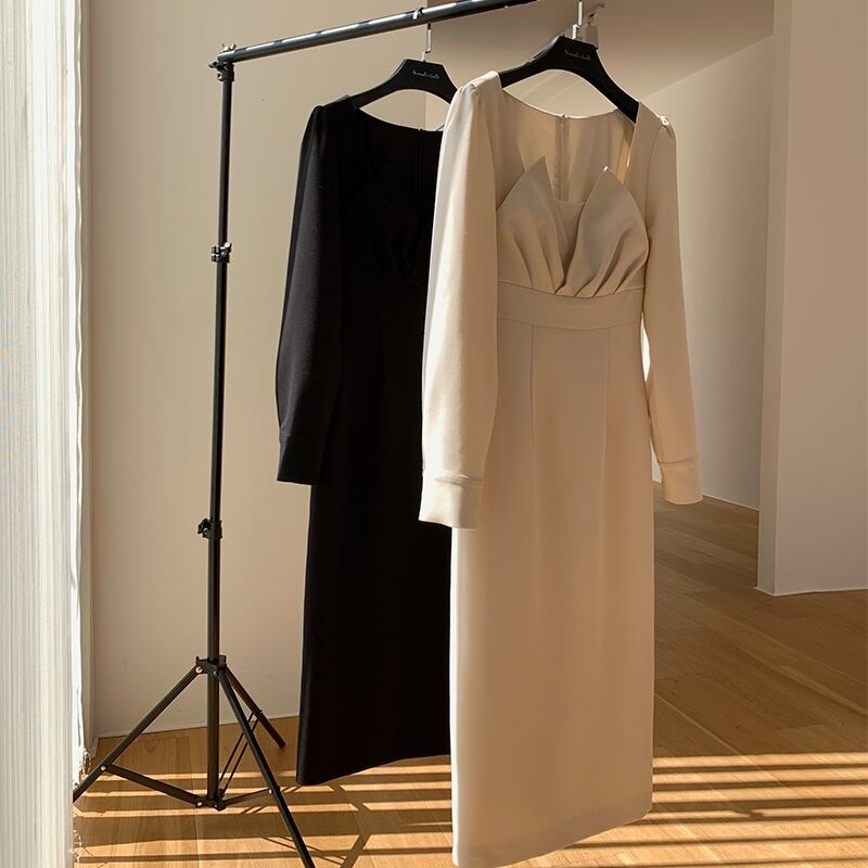2021年秋新作軽快な女性のハイレベルなウエスト感と薄手の気質のスクエアネックデザインの長袖ワンピース感 ロング オータム 秋物 スクウェア yingd78664121625