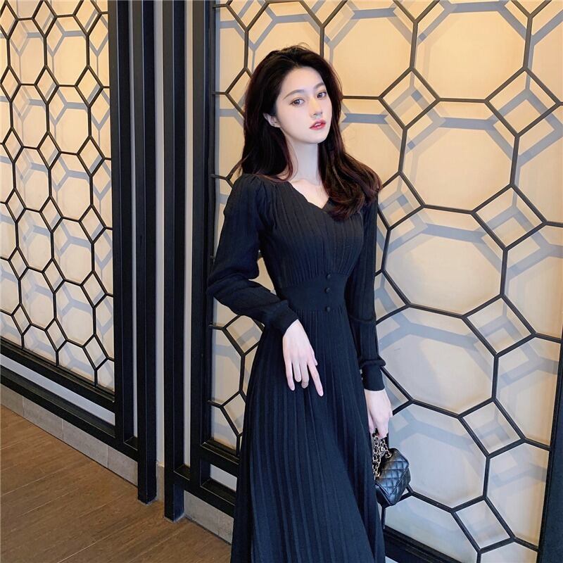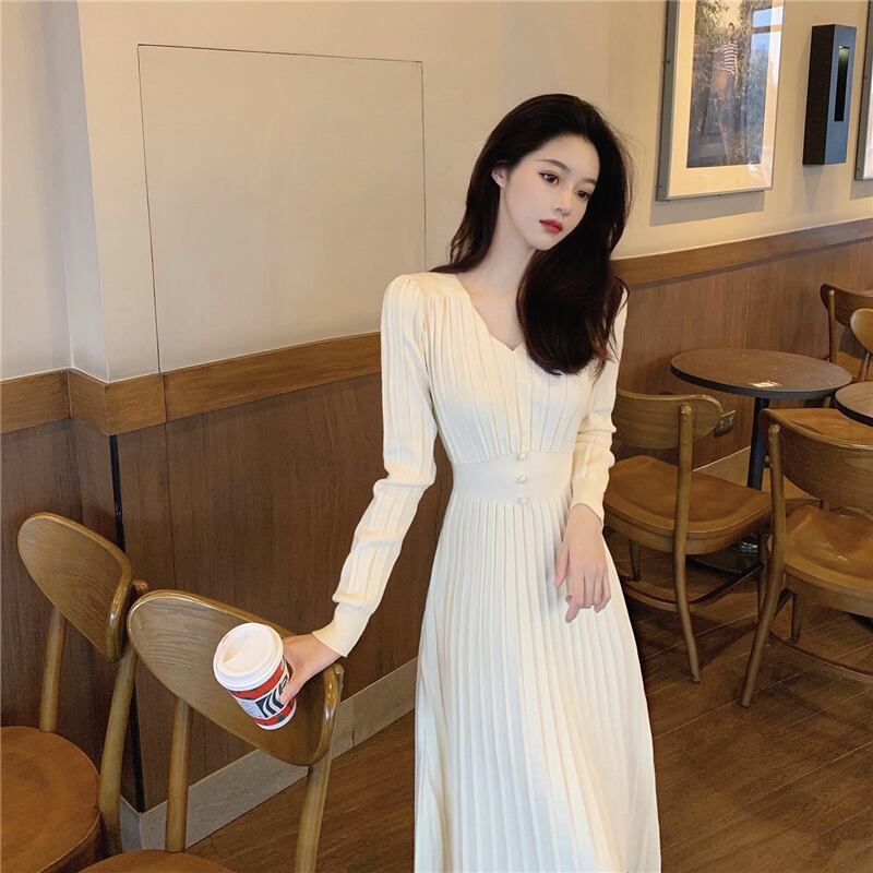 フレンチレトロロングセータードレス膝上Vネックコート付きウィンタースカート厚手ニットワンピース秋冬女性 オータム 秋物 冬物 yingd54042908212