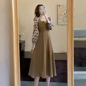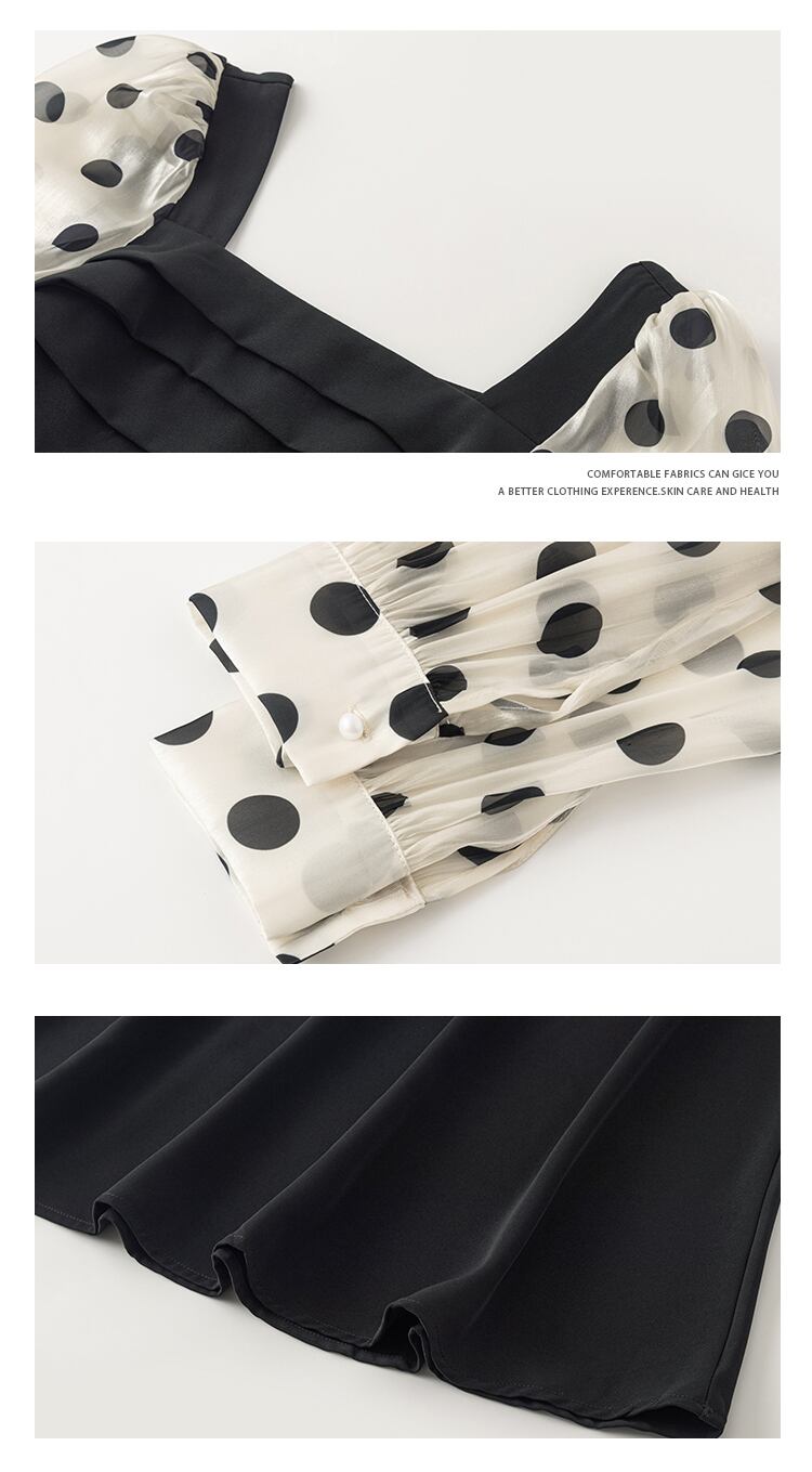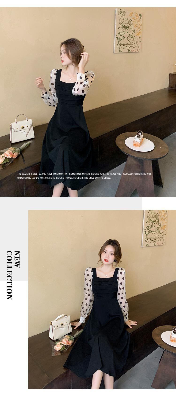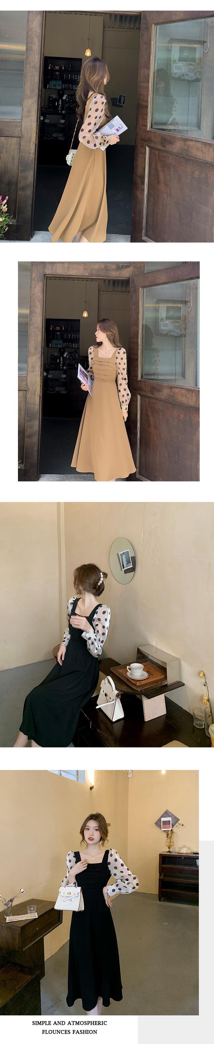 2021年秋新しいフレンチ水玉ドレスレディースウエストスリミング気質長袖スクエアネックオーバーザニースカート ロング オータム 秋物 スクウェア yingd67694362805