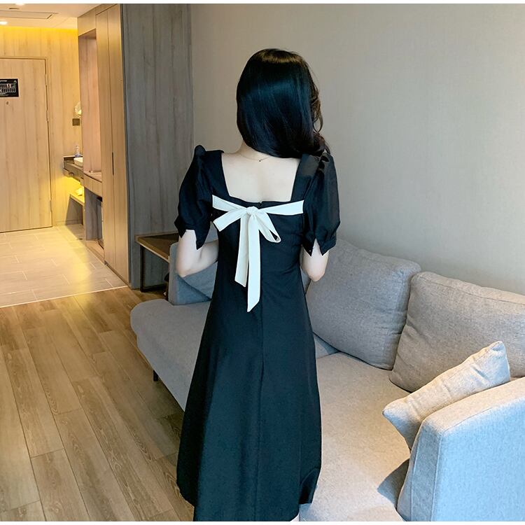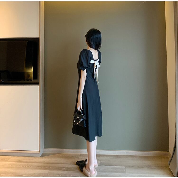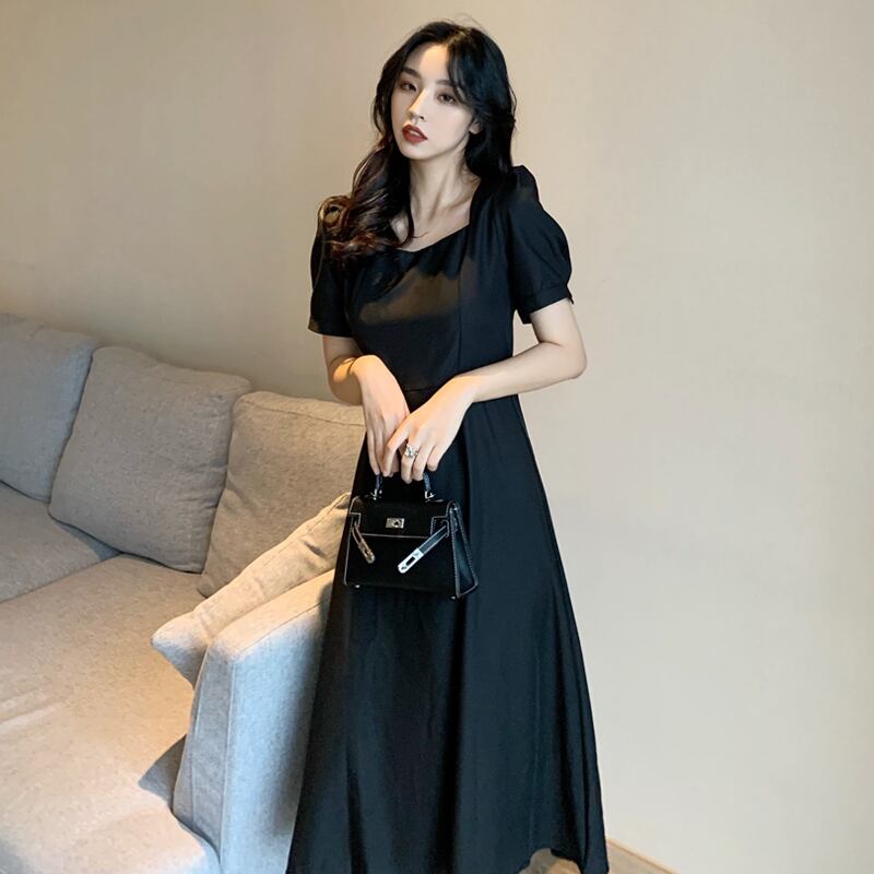 フランスのレトロなヘップバーンスタイルの小さな黒いドレスのウエストは細く、デザインセンスのニッチなスクエアカラーの黒いドレスの女性の夏 ブラック サマー 夏物 スクウェア yingd40893122206