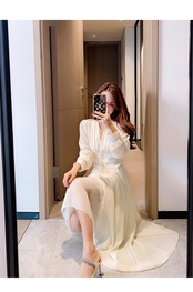 2020年秋新しい女性のフランスのレトロなウエストウエストと細い気質のVネックパフスリーブ穏やかな風のドレスの女性 オータム 秋物 yingd10604940889