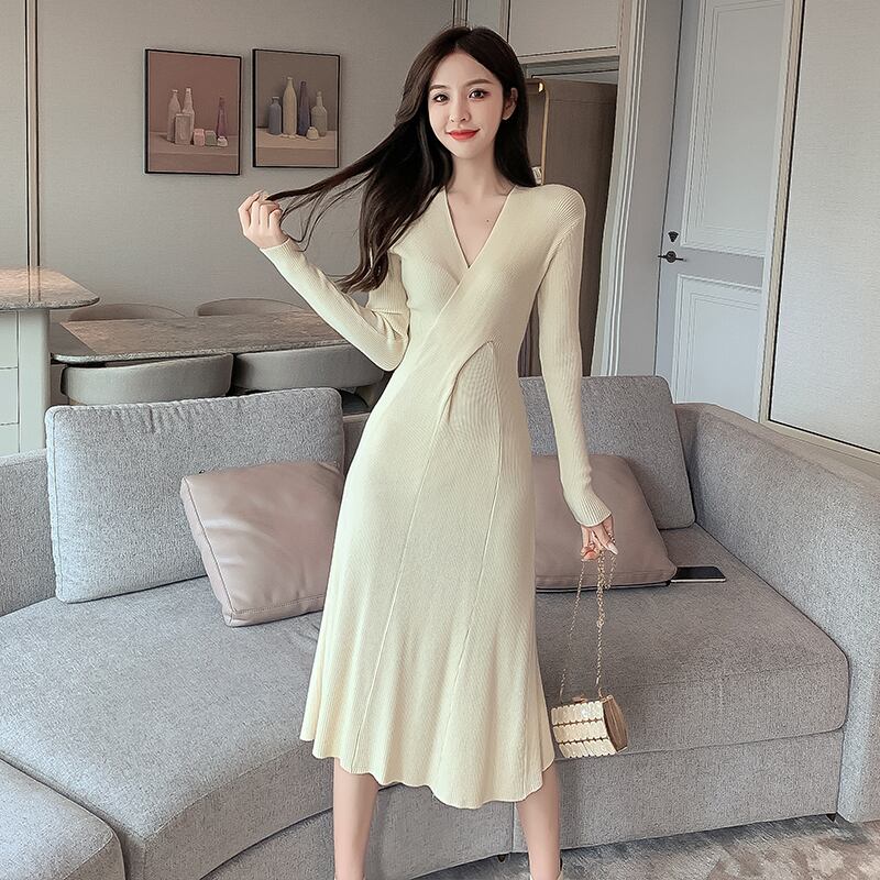 フランスのレトロなヘップバーンスタイルのウエストは細くて気質のVネックイヤースカート赤いニットドレス女性の秋と冬 レッド オータム 秋物 ウィンター 冬物 yingd50755461381