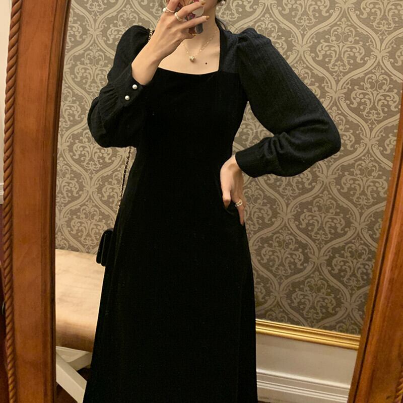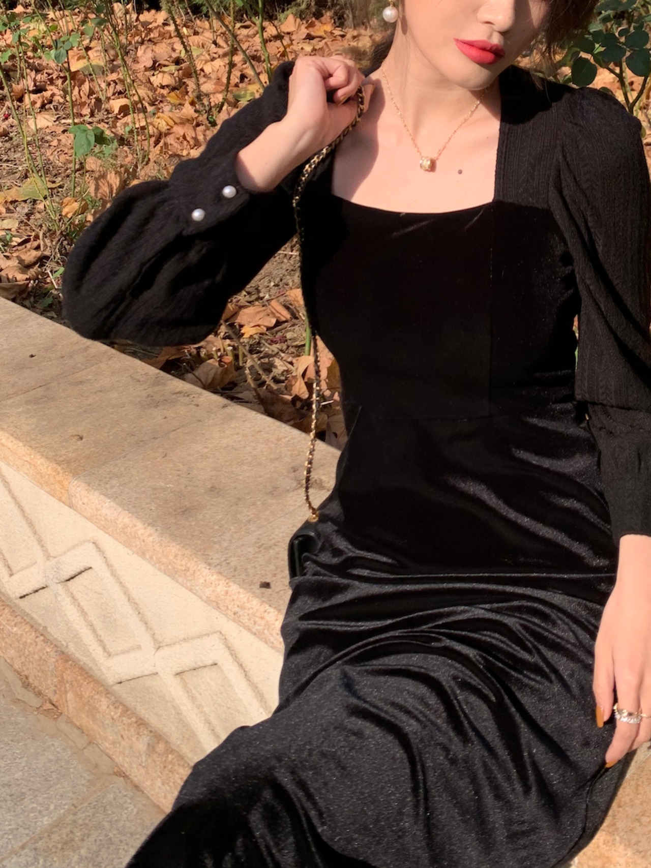フランスのレトロなウエスト、薄くて軽い、豪華なレディースデザイン、スクエアネックのニットベルベットドレス、女性の秋と冬 オータム 秋物 ウィンター 冬物 スクウェア yingd44020209376