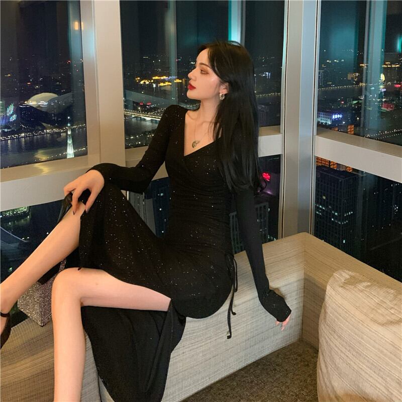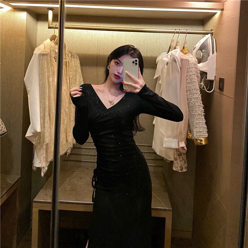 2021年春の新しいフランスのレトロな黒のロングスカートは薄くて高品質のセクシーなVネックスリムドレスです ブラック スプリング 春物 yingd70150781599