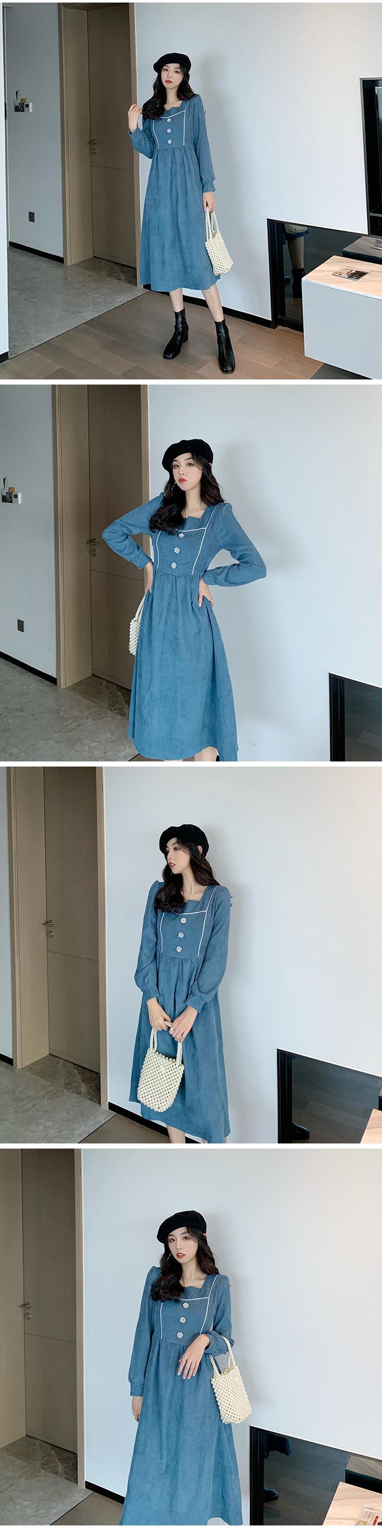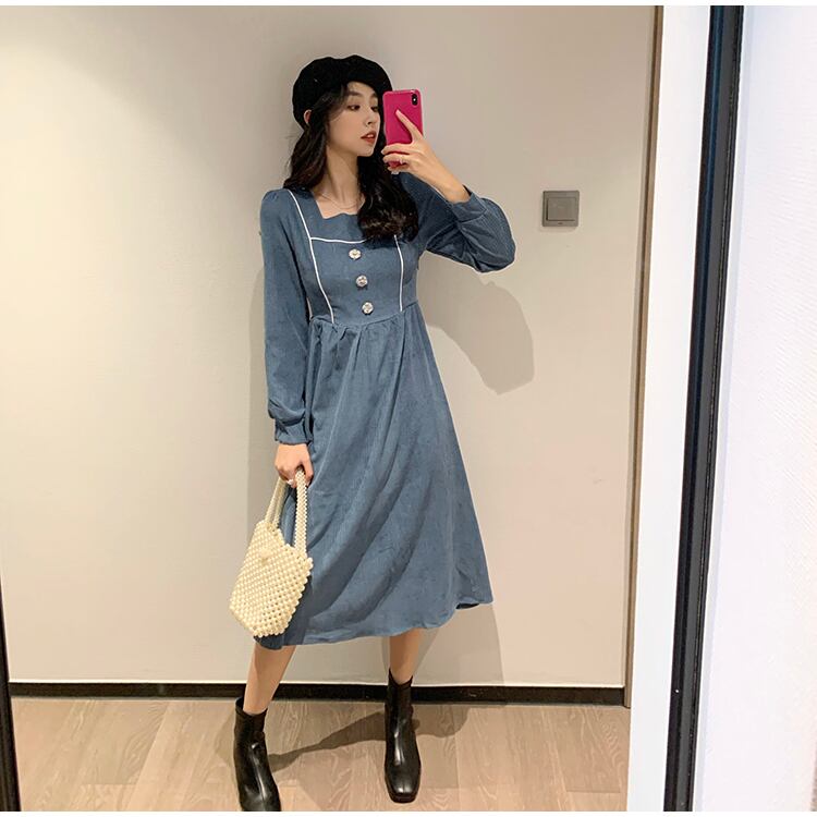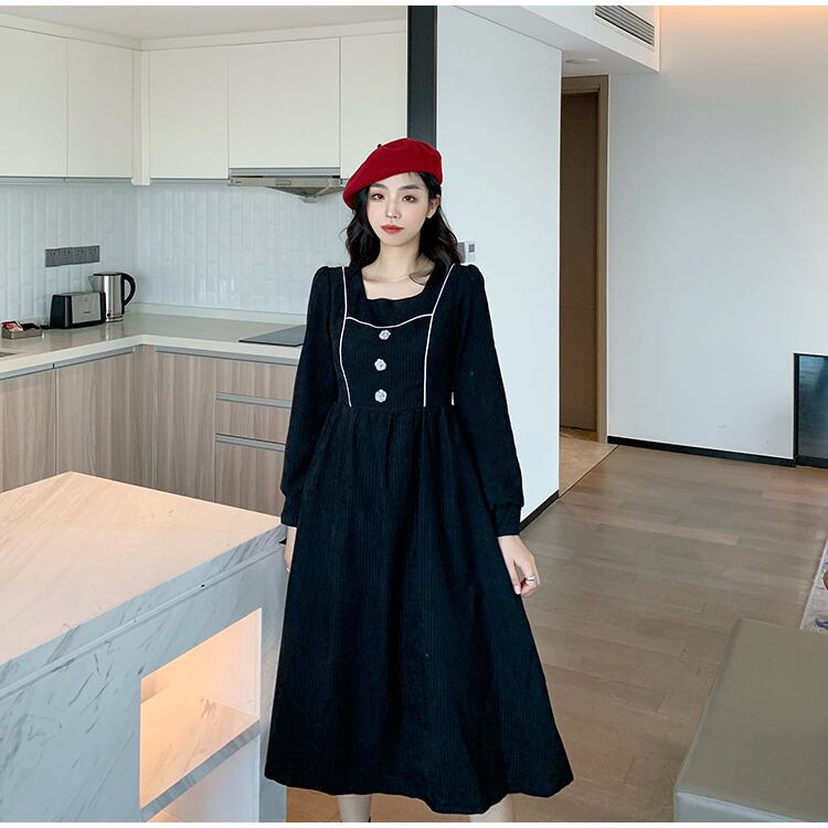 フランスのレトロなヘップバーンスタイルのリトルブラックドレスのウエストは細く、気質のスクエアネックコーデュロイ長袖ドレス女性の秋と冬 ロング オータム 秋物 ウィンター 冬物 スクウェア yingd31635104387