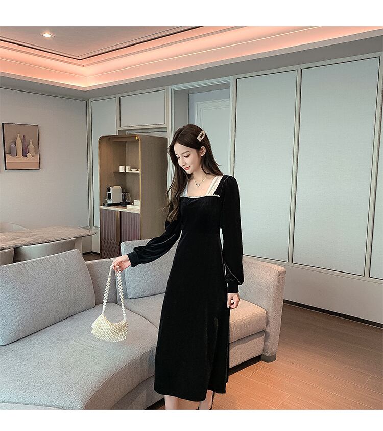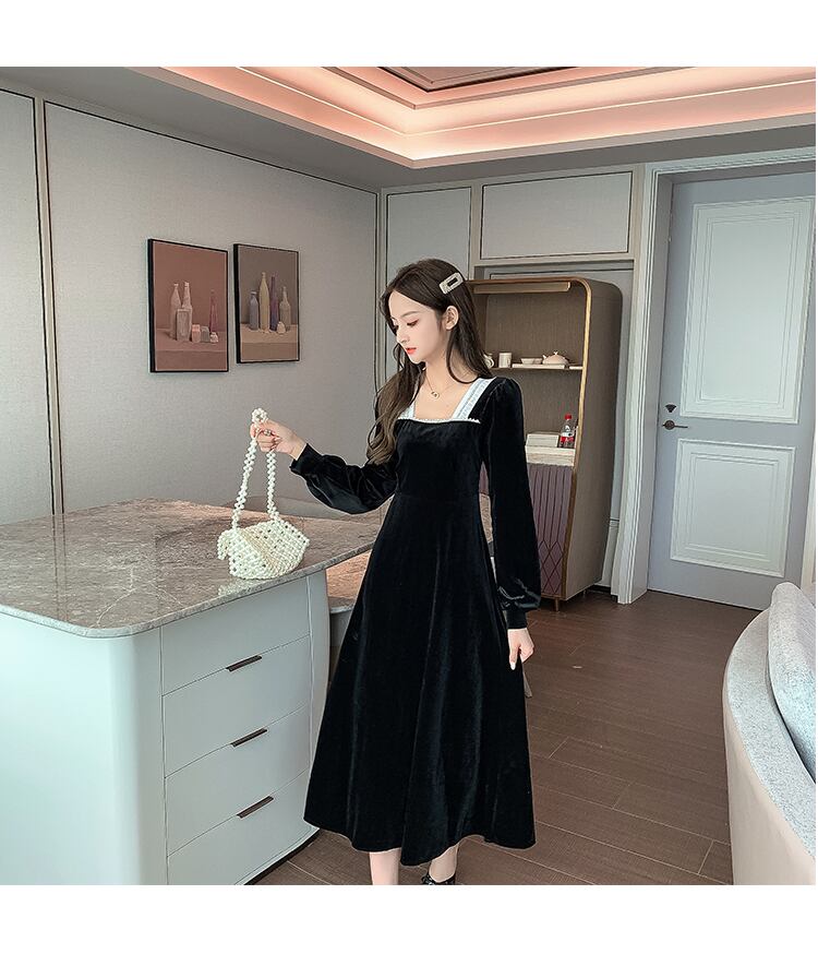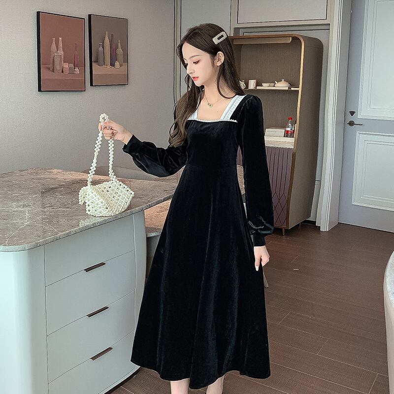 フランスのレトロなヘップバーンスタイルのリトルブラックドレスのウエストは細く、デザインセンスのスクエアネックベルベットドレスの女性の秋と冬 オータム 秋物 ウィンター 冬物 スクウェア yingd53591860387