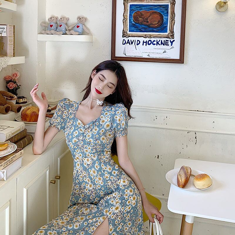 フランスのレトロなヘップバーンスタイルの花柄のドレス、ウエストと薄さ、小さなデイジーパフスリーブ花柄のドレス女性の夏 サマー 夏物 yingd24777117263