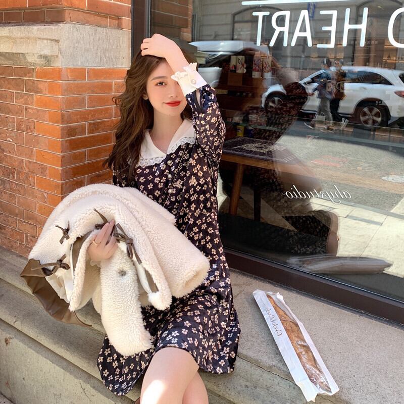 2021年春の新しい女性フレンチレトロウエスト細いAラインスカート穏やかな風長袖花柄ドレス女性 ロング スプリング 春物 yingd69538557371