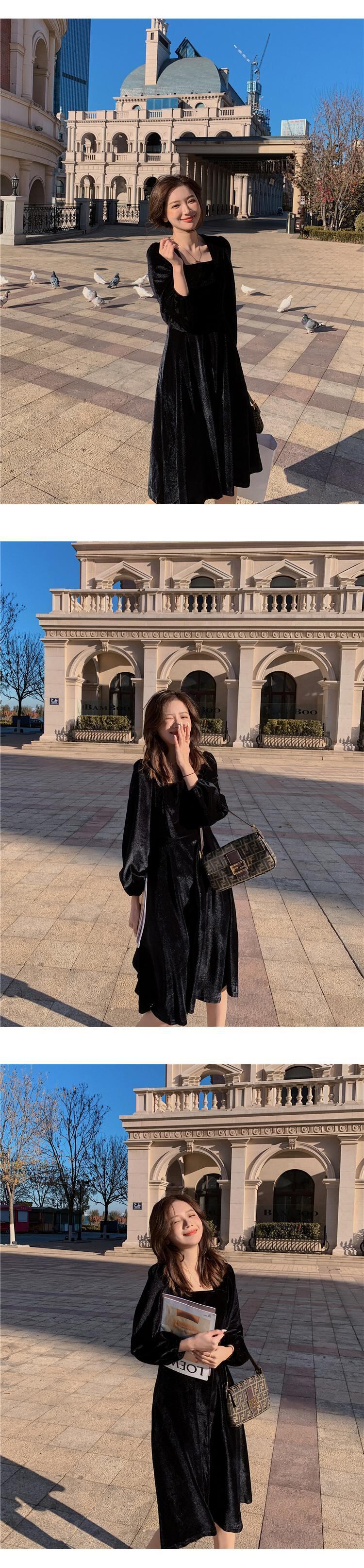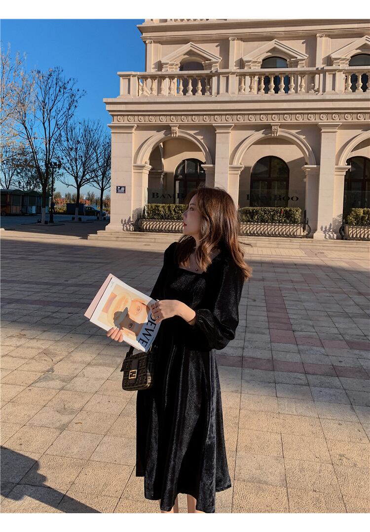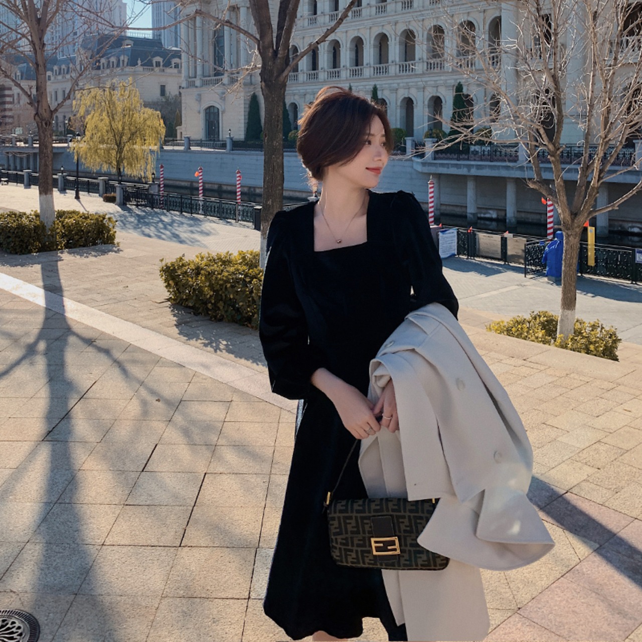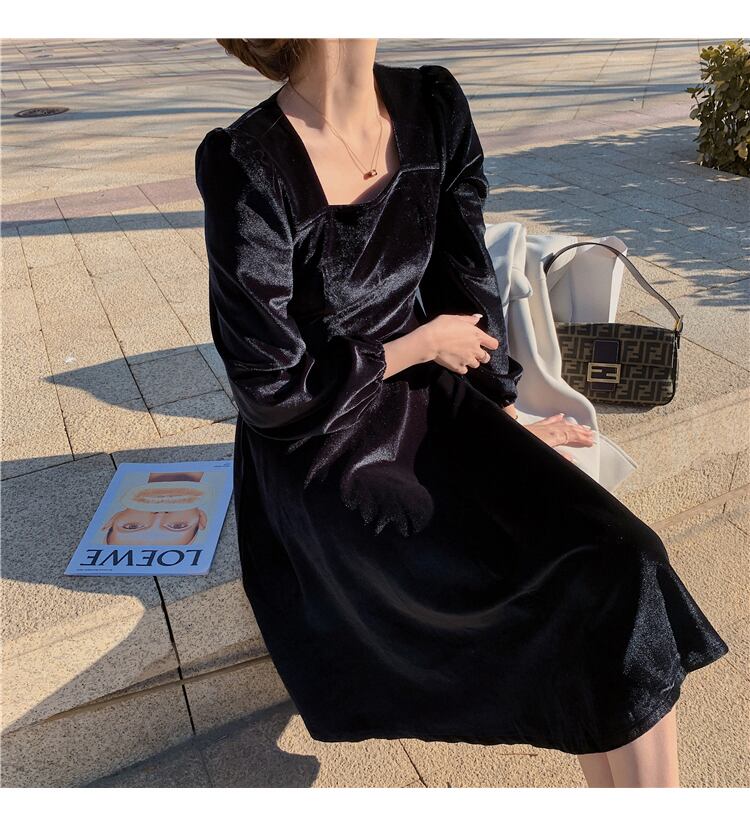 フランスのレトロなヘップバーンスタイルのリトルブラックドレスのロングスカートは薄くて気性が高く、軽く調理されたスクエアカラーのベルベットドレスの女性の秋と冬 オータム 秋物 ウィンター 冬物 スクウェア yingd70643144947