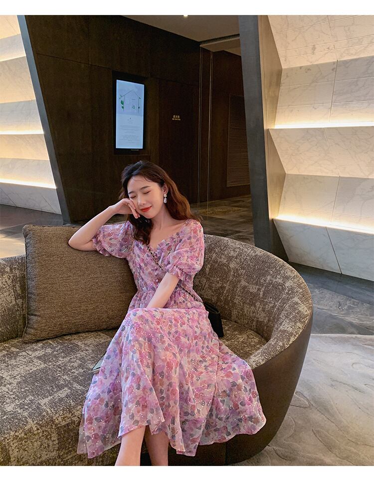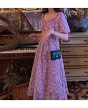 フランスのレトロな優しい風ウエスト細い気質小さなスカートスクエアネックパフスリーブスパンコール花柄ドレス女性の夏 サマー 夏物 スクウェア yingd54785086090