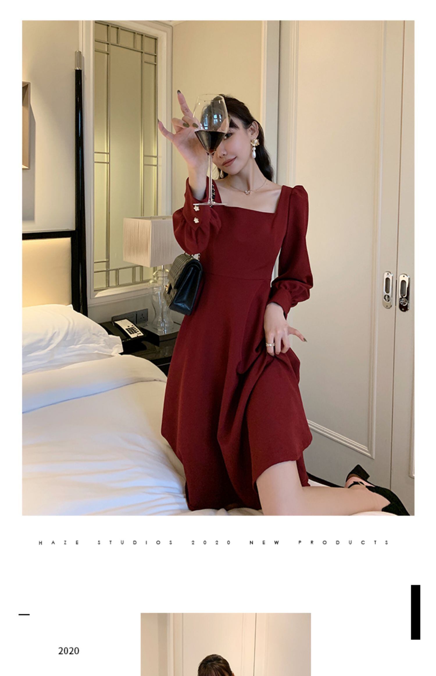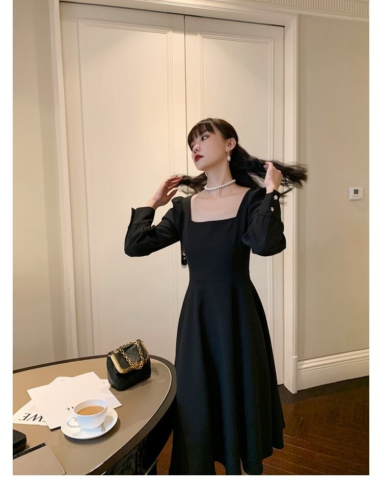 2021年春新作レディースウエストスリミング気質冷風レディースハイレベル感スクエアネック長袖ワンピースレディース ロング スプリング 春物 スクウェア yingd42764909346