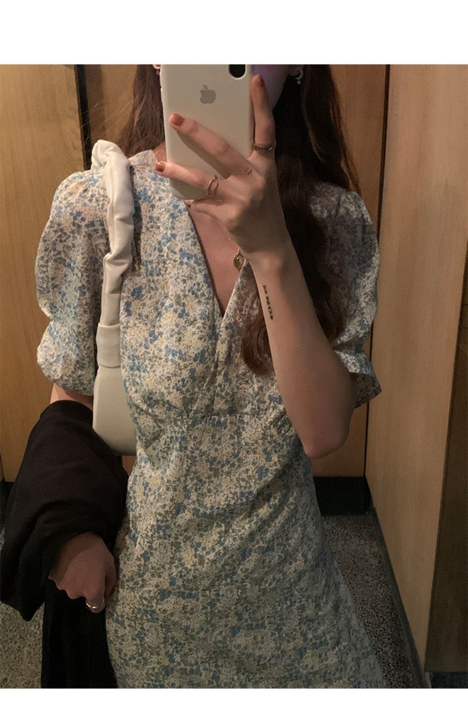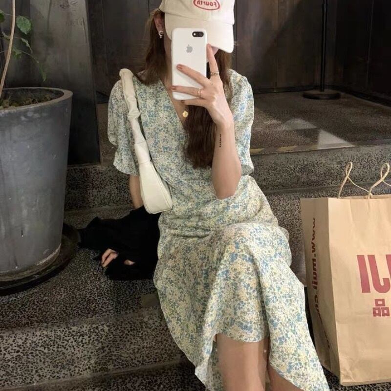 フランスの桔梗スカート、初恋、小さくて優しい風、塩、甘い、ウエスト、細い、Vネックフローラルドレス、女性の夏 大人ガーリー スウィート キュート カジュアル サマー 夏物 花柄 フラワーデザイン yingd51122607821