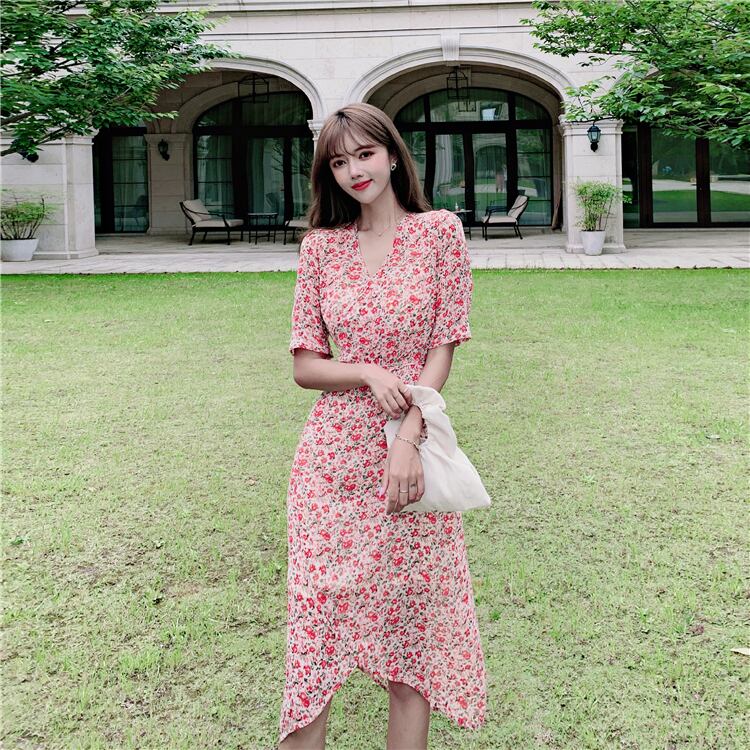 2021年夏新しいフランスのレトロなヘップバーンスタイルの花柄のドレスは塩にすることができます甘いVネックウエスト花柄のドレス女性にすることができます 大人ガーリー スウィート キュート カジュアル サマー 夏物 yingd57299856418