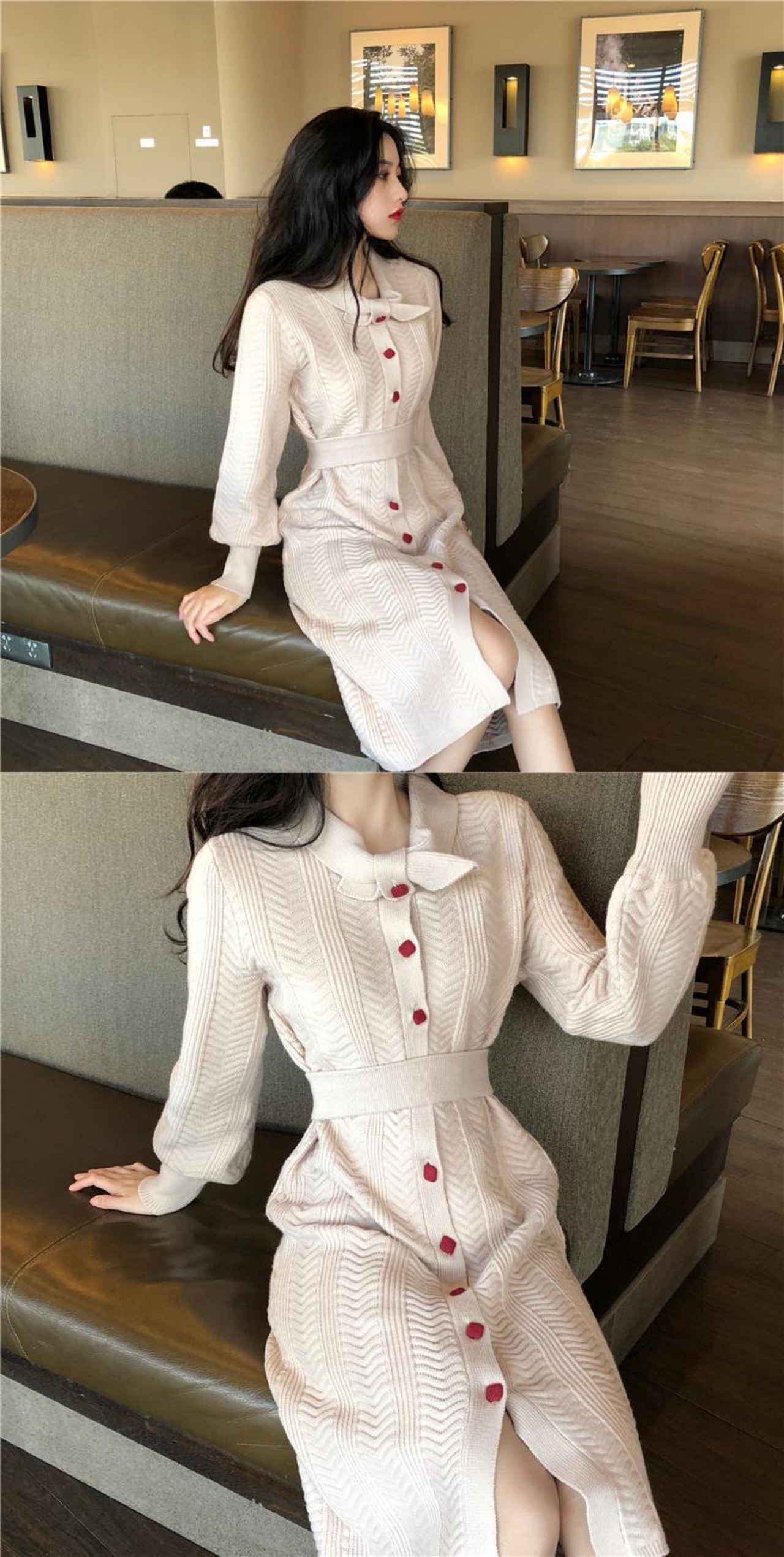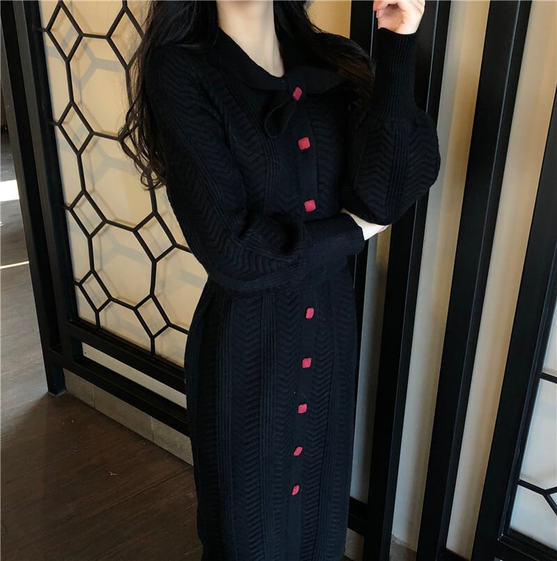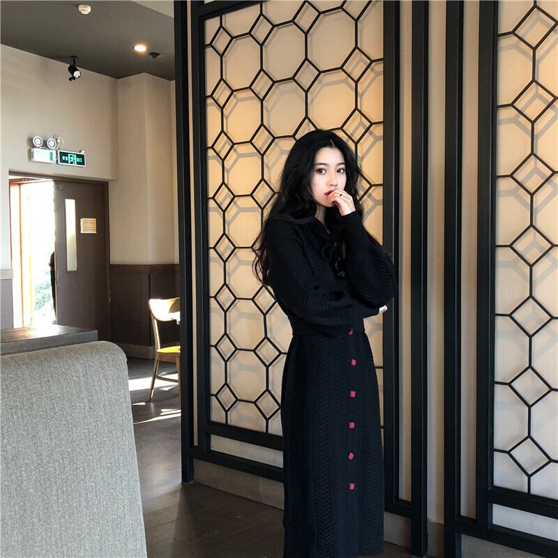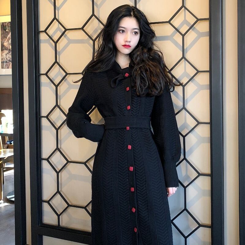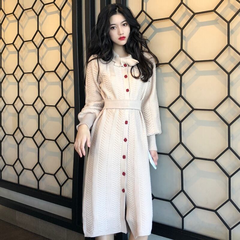 フランスのレトロなヘップバーンスタイルのウエストと薄い気質の長袖ニットドレスの女性の秋と冬の長い膝上セータードレス ロング オータム 秋物 ウィンター 冬物 yingd11089678238