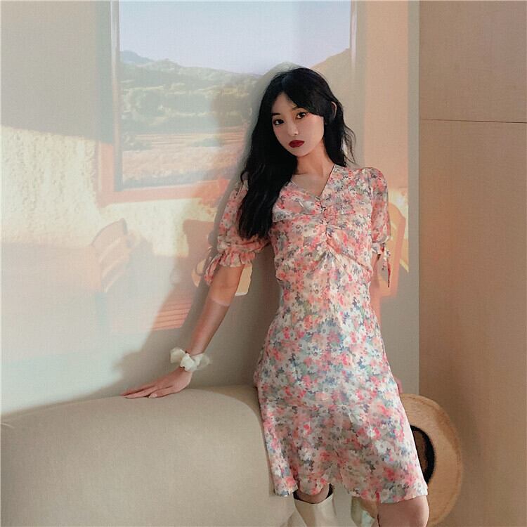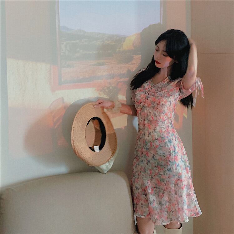 フランスのレトロなニッチフローラルスカート気質ウエストスリミングVネック小さな新鮮なフローラルフローラルドレス女性の夏 サマー 夏物 花柄 yingd81043697249