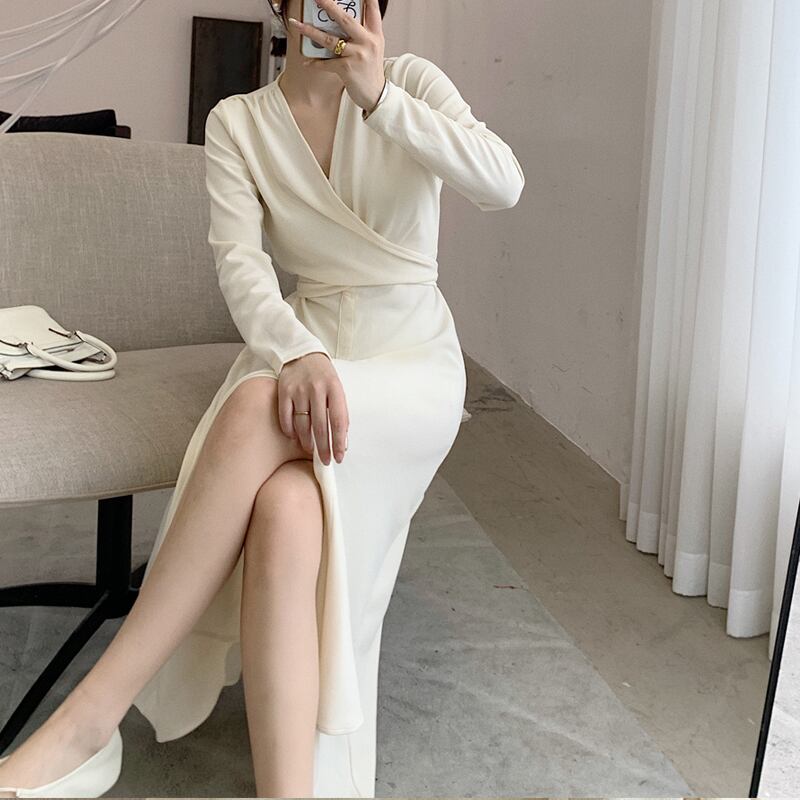 フランスのレトロなロングスカートは薄くて気質の高い女神ファン青州スタイルのセクシーなスプリット長袖ドレス秋と冬の女性 オータム 秋物 ウィンター 冬物 yingd47682449336