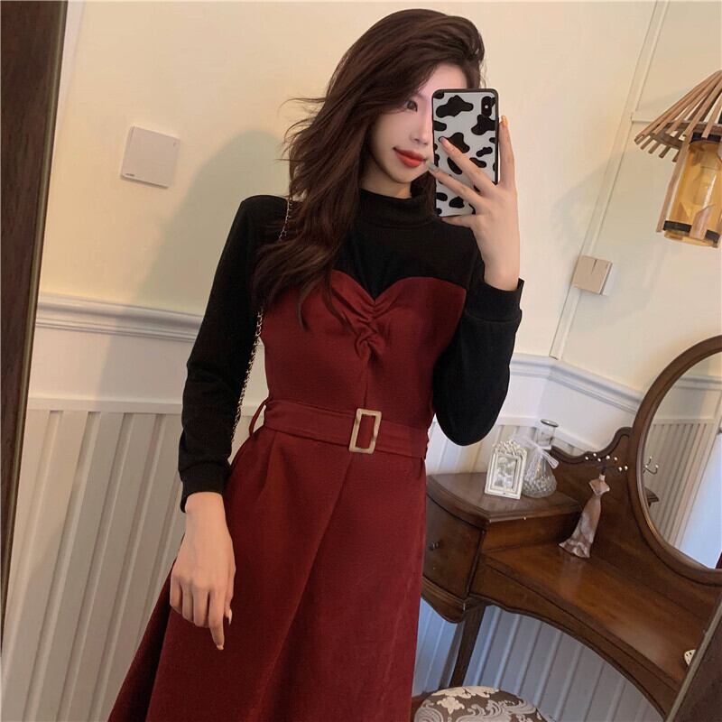 フランスのレトロなヘップバーンスタイルのウエストは細くて気質の女神ファンの偽のツーピース長袖ボトミングドレス女性の秋と冬 ロング オータム 秋物 ウィンター 冬物 yingd13294816346