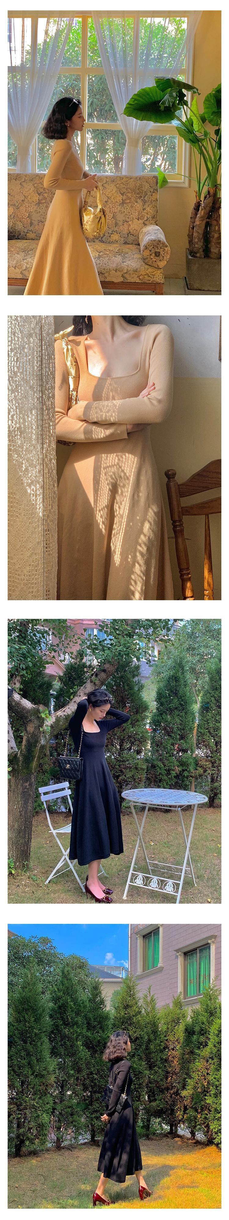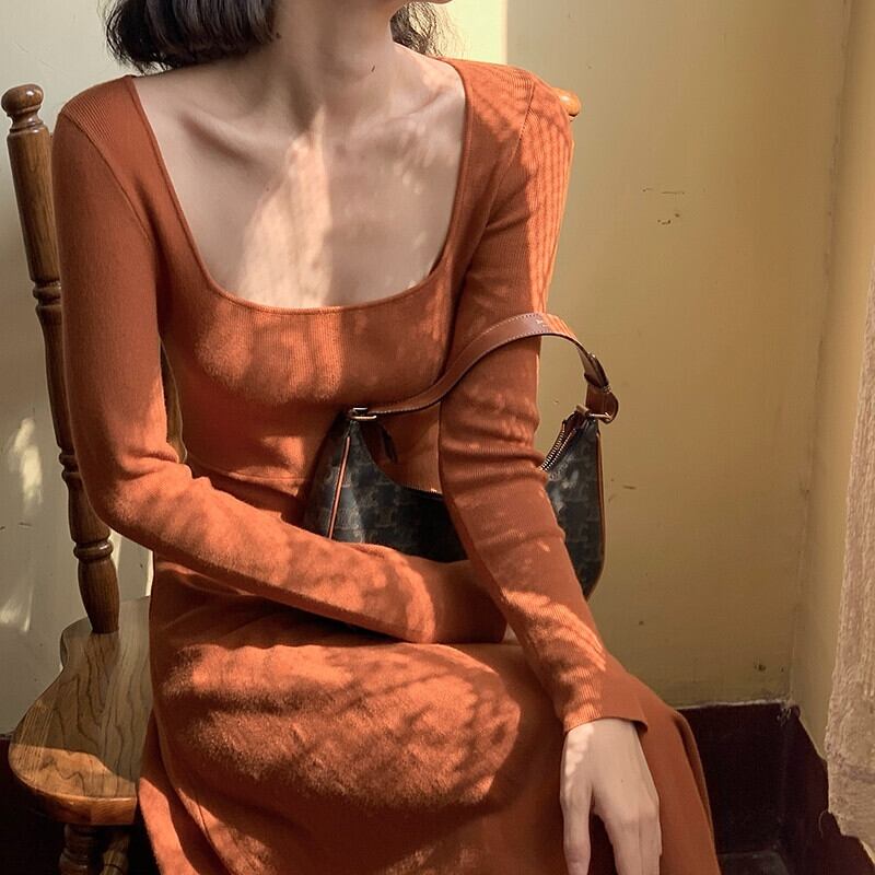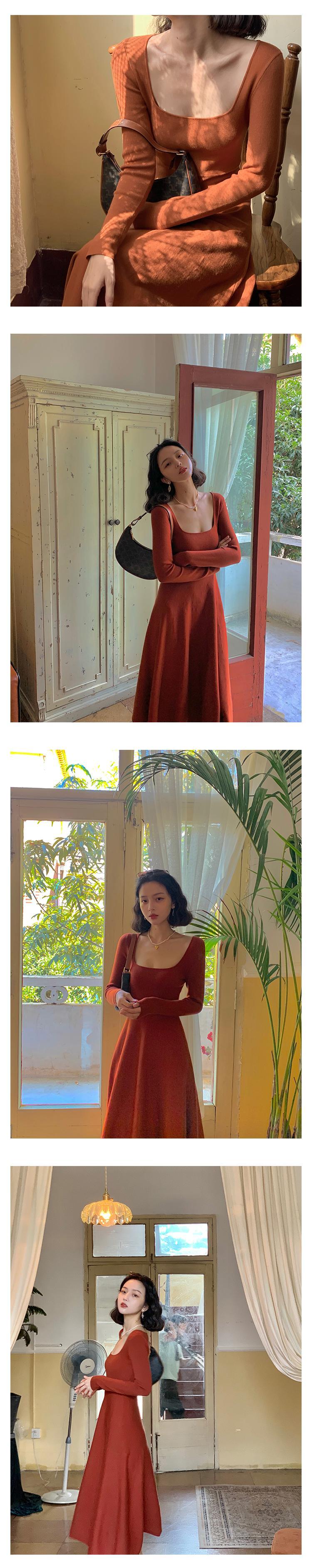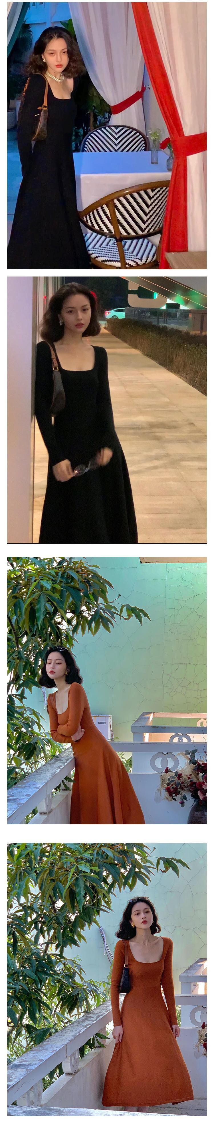 フレンチレトロヘップバーンスタイルスクエアネックオーバーザニーロングスカートスリムスリミング気質セクシーベースニットワンピース秋冬 オータム 秋物 ウィンター 冬物 スクウェア yingd83915872893