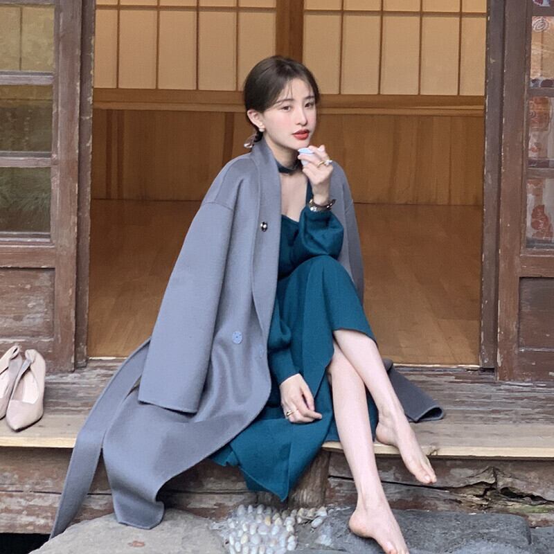 フランスのレトロなニッチな膝上ロングスカートウエストは細く、ハイエンドな長袖スクエアネックニットワンピース秋冬感 オータム 秋物 ウィンター 冬物 スクウェア yingd87578958324