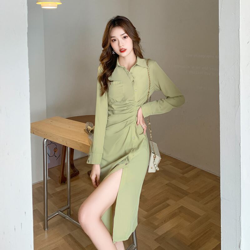 2021年秋ニュースタイルフレンチレトロシックなデザインロングスカートウエストスリミング長袖シャツドレス女性 オータム 秋物 yingd98098324210