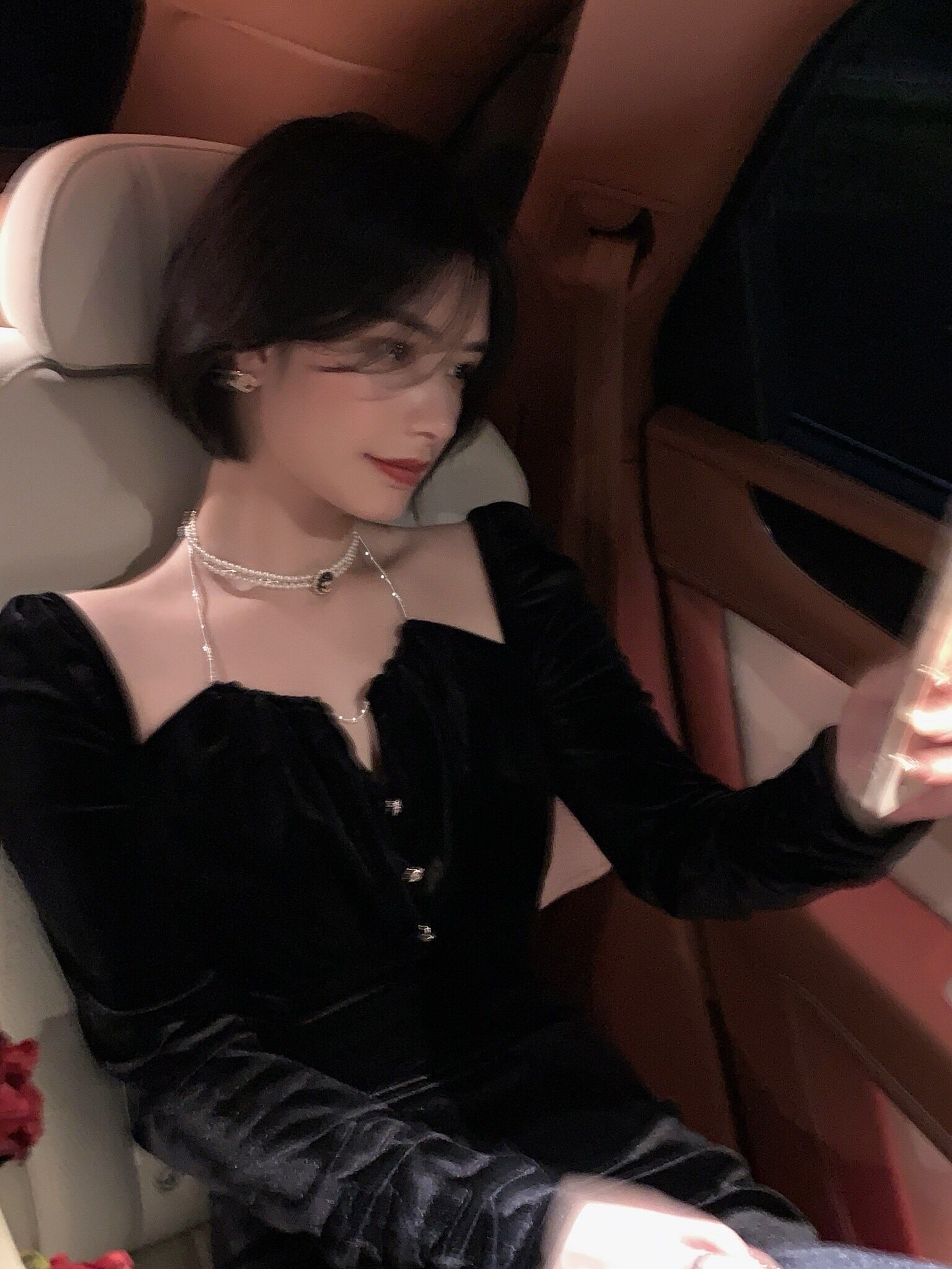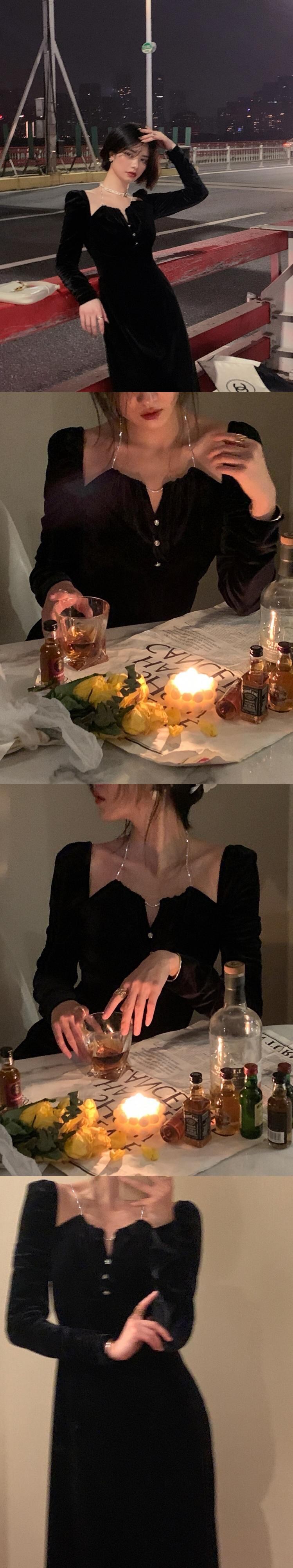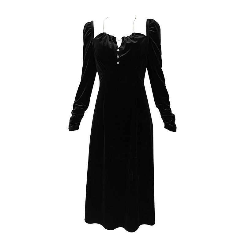 ライトラグジュアリー婦人服初秋フレンチレトロヘップバーンスタイルリトルブラックドレスデザインパフスリーブブラックベルベットドレスレディース オータム 秋物 yingd47721886230