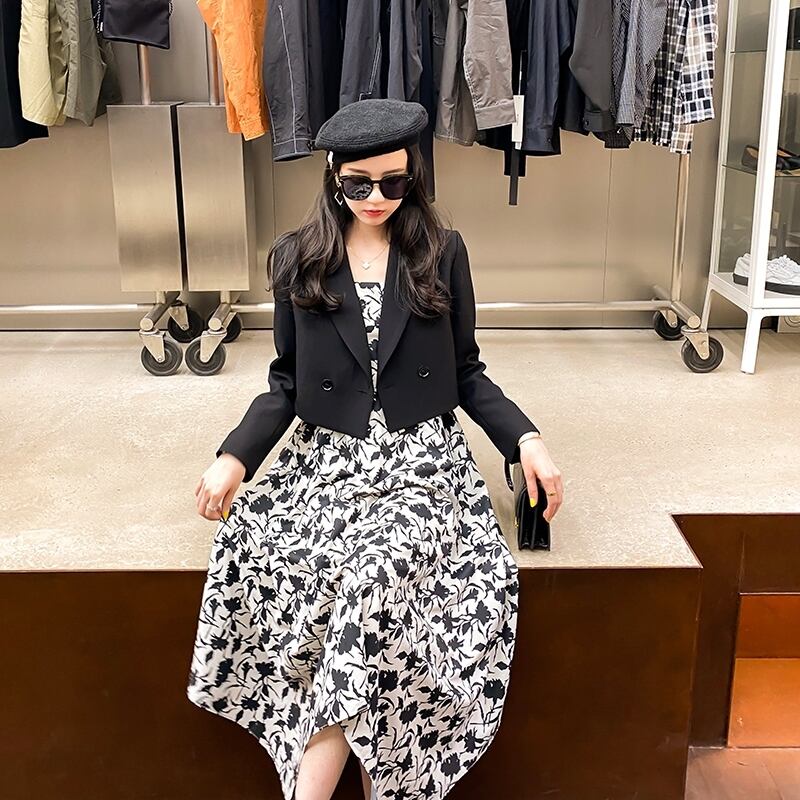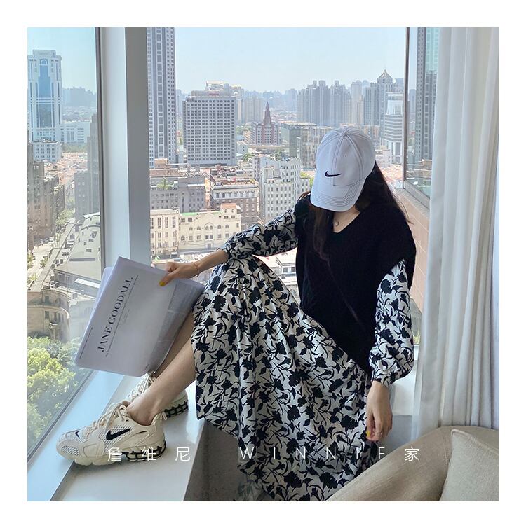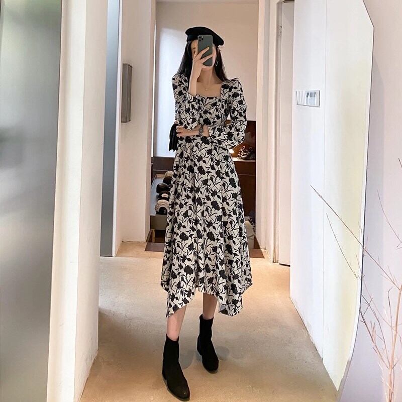 フランスのニッチな膝上ロングスカート、ウエストは細くて気質、ヘップバーンスタイル、高級感のあるスクエアネックフローラルドレス、女性の秋の服 オータム 秋物 花柄 スクウェア yingd33992759747