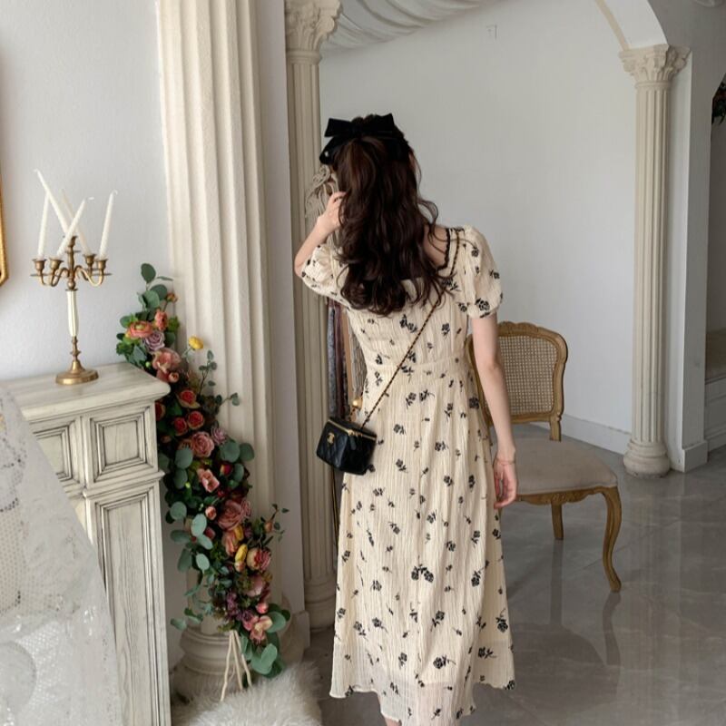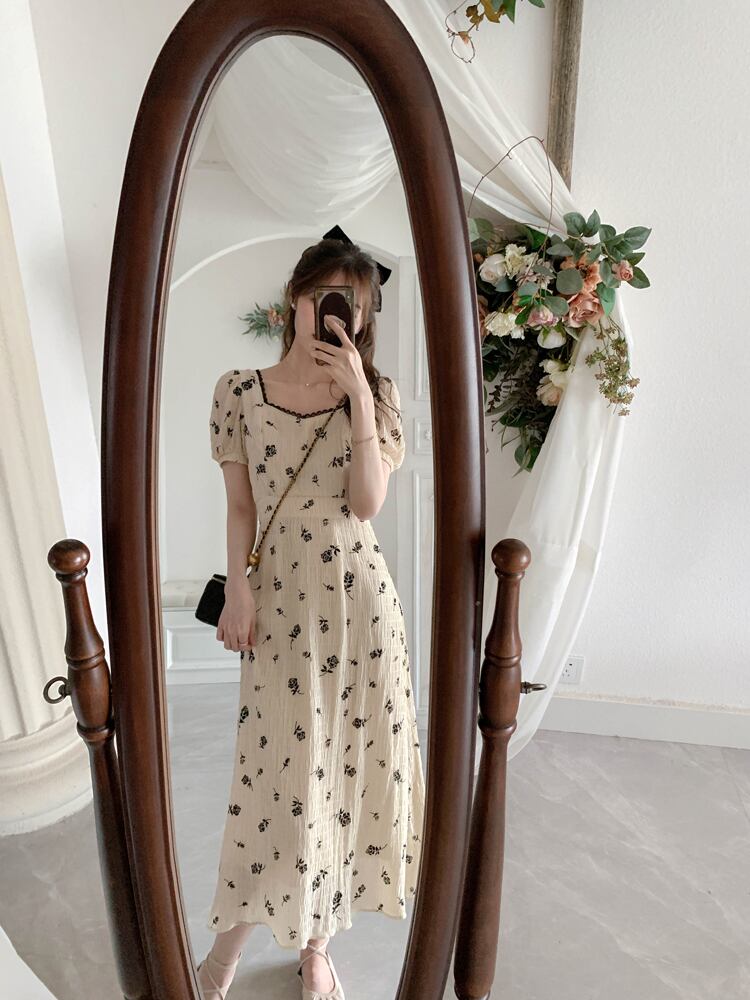 フランスのレトロなプラティコドンティーブレイクドレスの女性のウエストウエストは細く、デザインセンスのニッチで、軽く調理された風のスクエアカラーのドレスの女性 スクウェア yingd25421123479