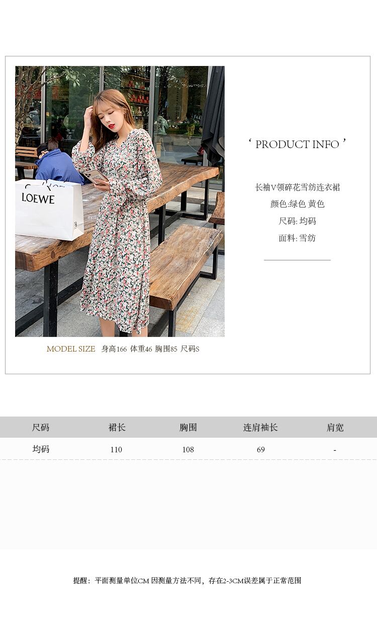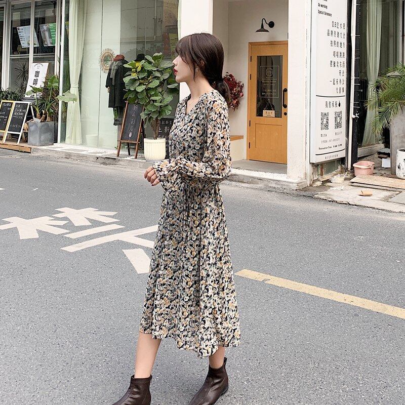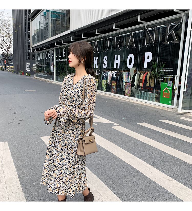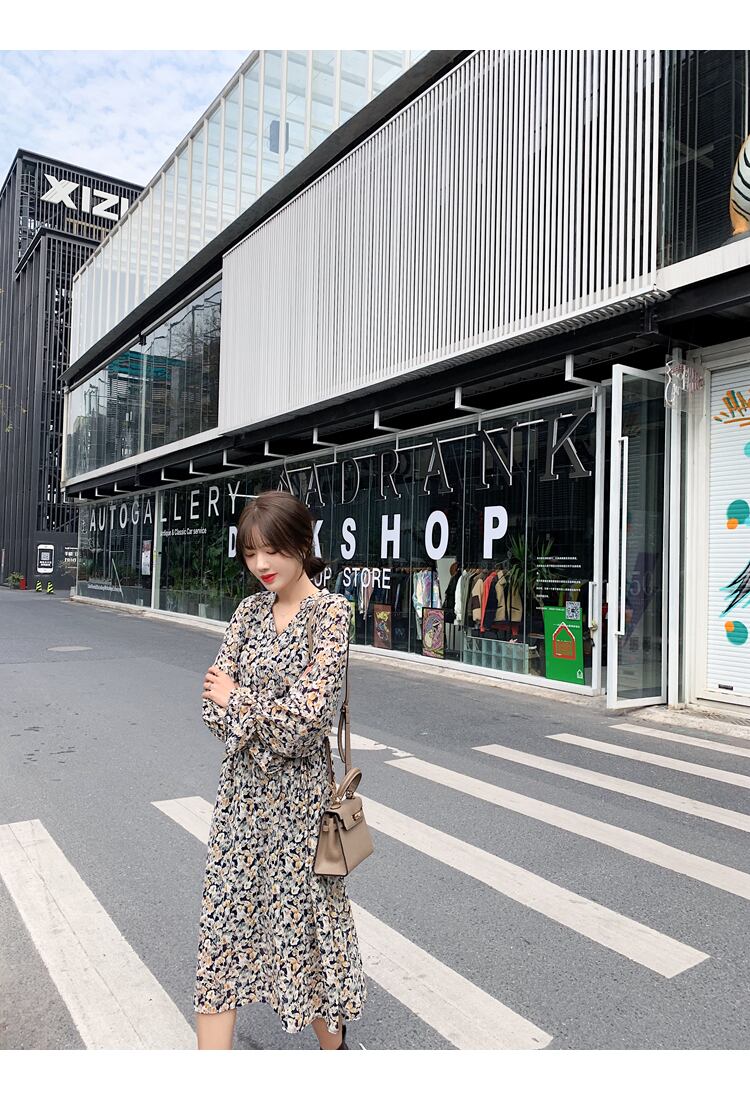 2020年春の新作フレンチレトロ気質Vネックシフォンフローラルドレスレディース春秋ウエストスリミングロングスカート スプリング 春物 オータム 秋物 花柄 yingd11665242784