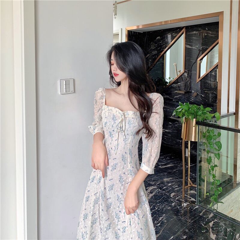 2021年春夏新作レディースフレンチレトロコールドウィンドハイレベルセンスの優しいスクエアカラーシフォンフローラルドレスレディース スプリング 春物 サマー 夏物 花柄 スクウェア yingd67736672664