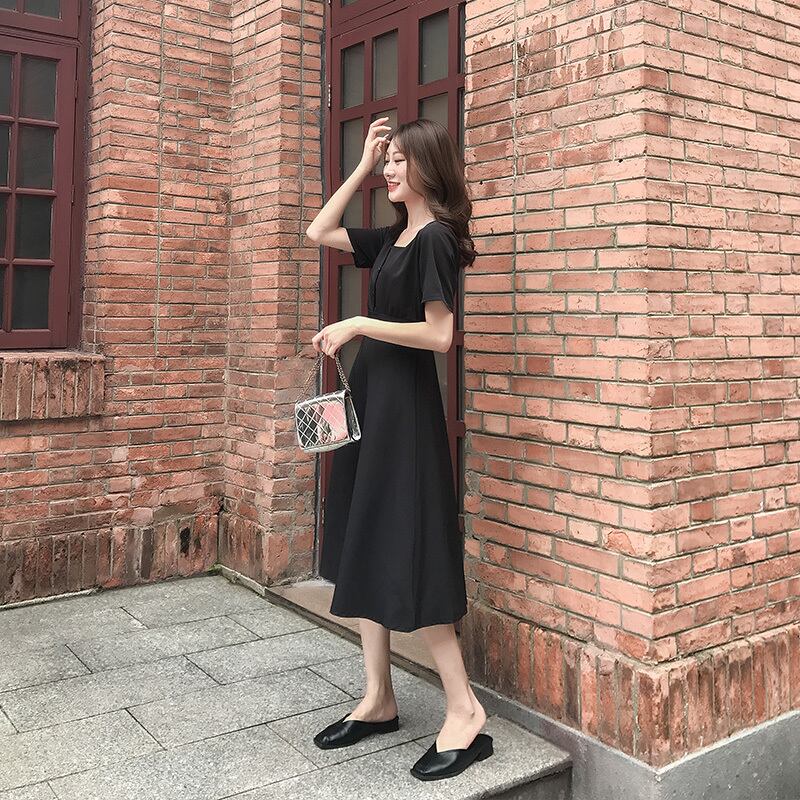 フランスのレトロなキキョウのティーブレイクスカートのウエストは薄くて気質ヘプバーンスタイルのスクエアカラーのドレス女性2021年夏新しい サマー 夏物 スクウェア yingd49011300056