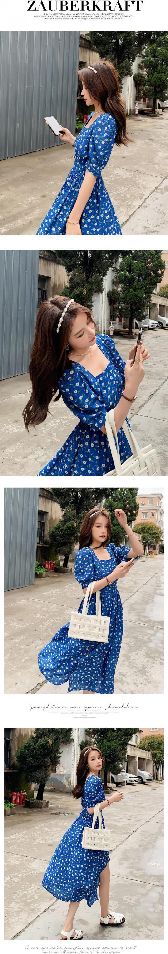 フランスのレトロなスクエアネック花柄ドレス女性の夏のドレス2021新しい青いパフスリーブスプリット花柄ロングスカート ブルー サマー 夏物 スクウェア yingd34035437318