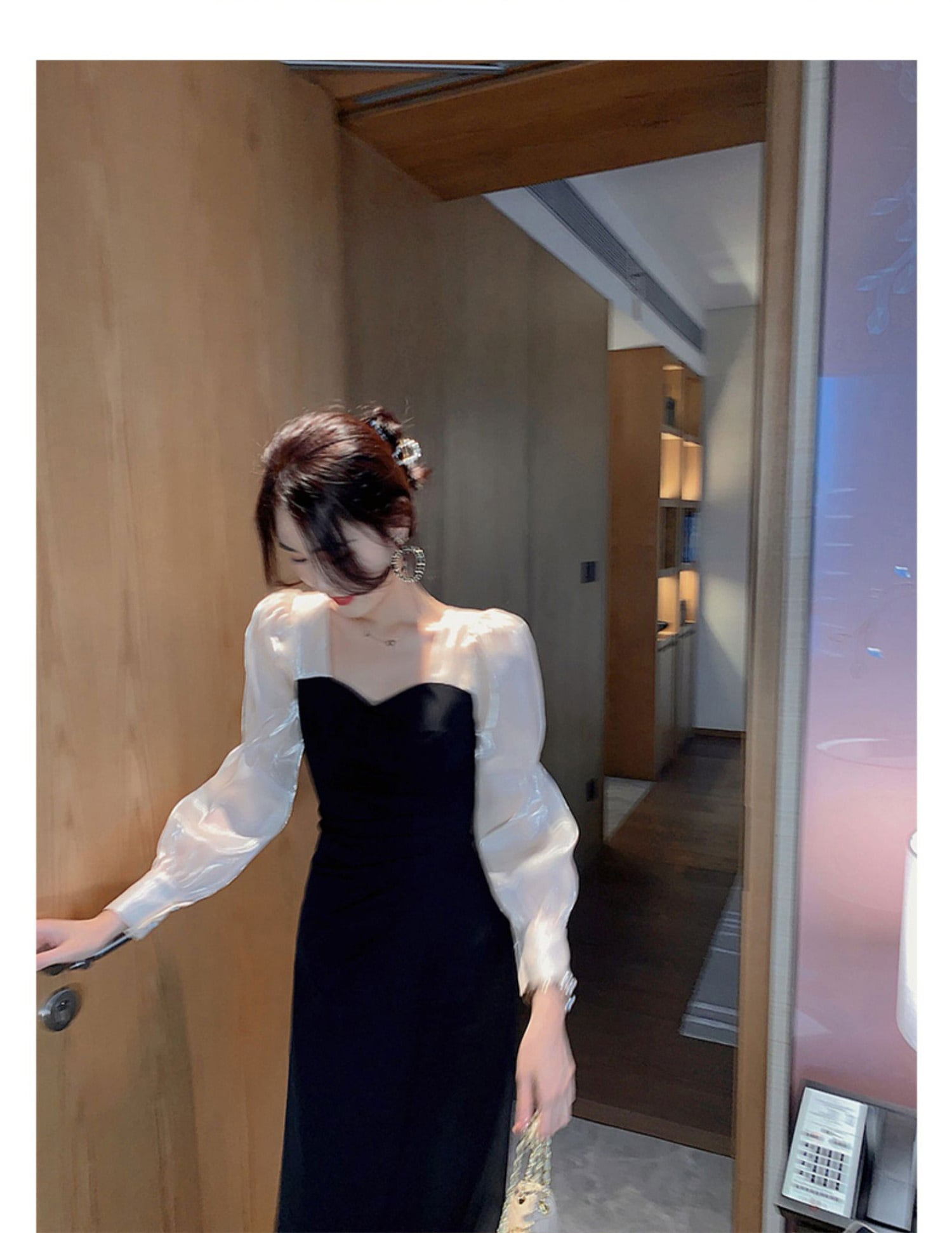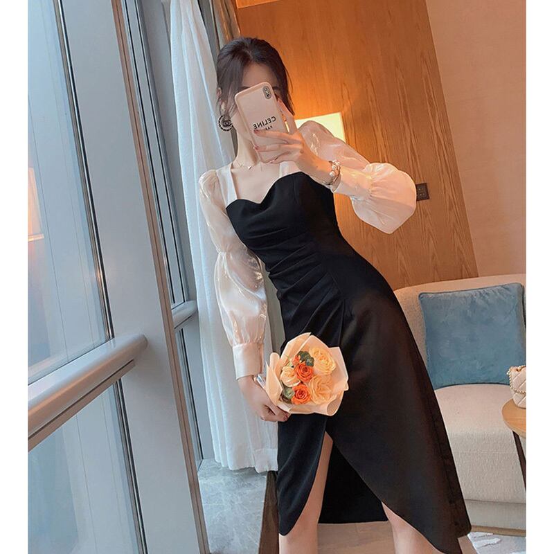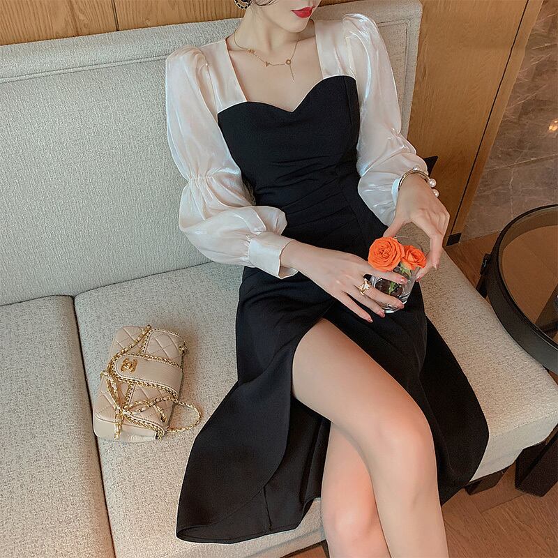 フランスのレトロなヘップバーンスタイルのリトルブラックドレス、シックなデザイン、高いスプライシングセンスのスクエアネックの妖精のドレス、薄い秋のドレス オータム 秋物 スクウェア yingd52056681539