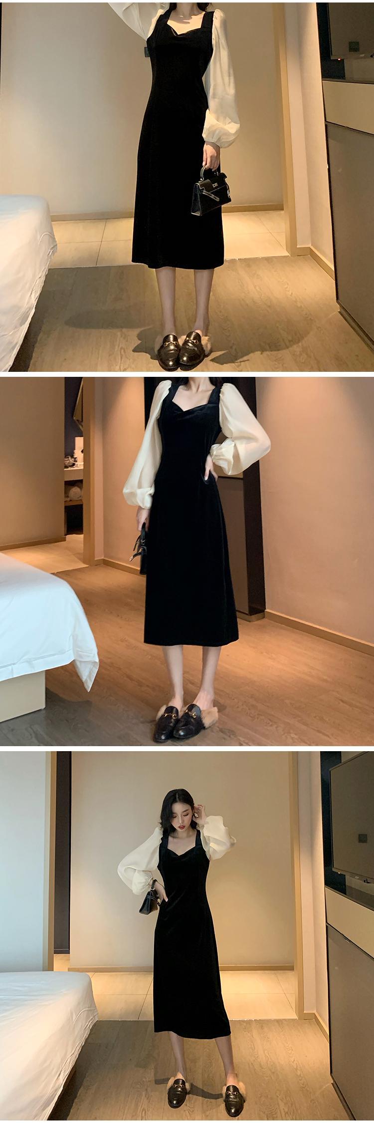 フレンチレトロスクエアカラーウエストウエストは細く、ライトラグジュアリーセレブリティライトマチュアスタイルパフスリーブベルベットドレス女性秋冬 オータム 秋物 ウィンター 冬物 スクウェア yingd78563424462