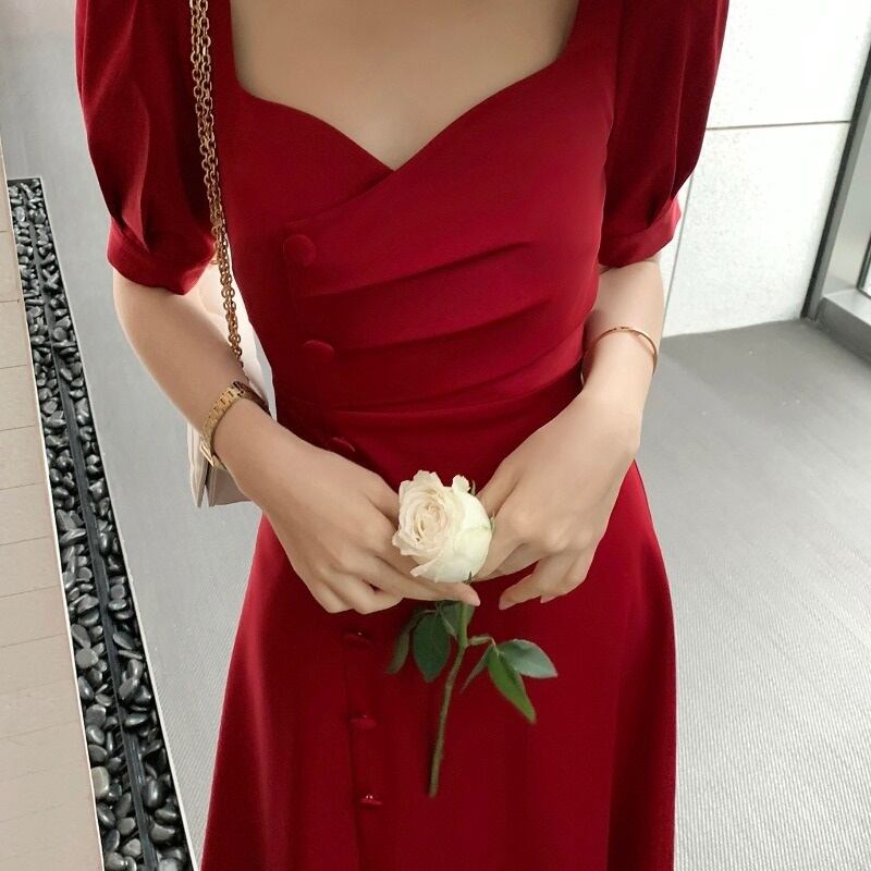 フランスのレトロシックなデザインセンスヘップバーンスタイルのロングスカートウエストは細く、高級感のあるスクエアカラードレス女性夏 サマー 夏物 スクウェア yingd74172186049