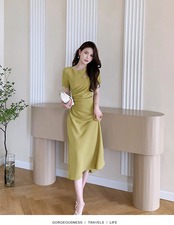 フランスのレトロなニッチな膝上ロングスカート、ウエストは細く、シックなデザイン、プリーツの高精細ドレス、女性の夏 サマー 夏物 yingd24259449450