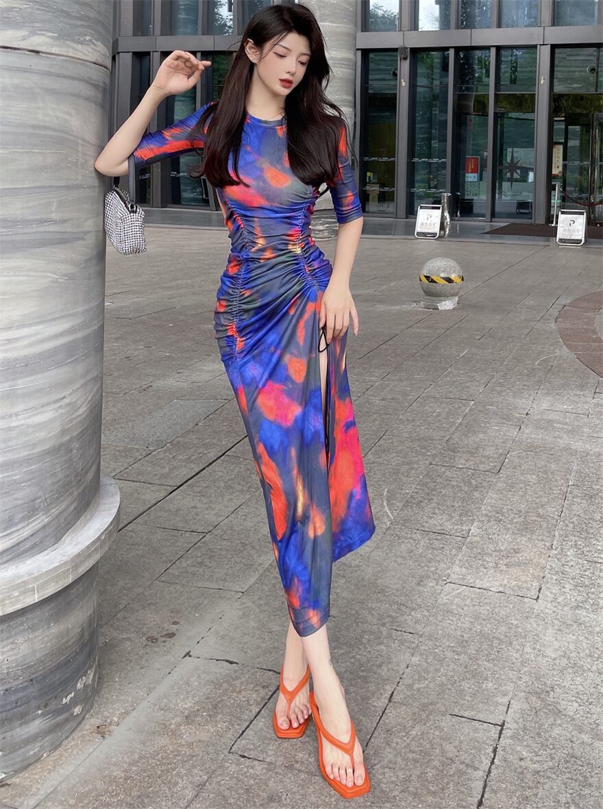 フランスのレトロなニッチな膝上ロングスカートシックなデザインセクシーなバッグヒップ巾着絞り染めスプリットドレス女性の夏 サマー 夏物 yingd68383806668