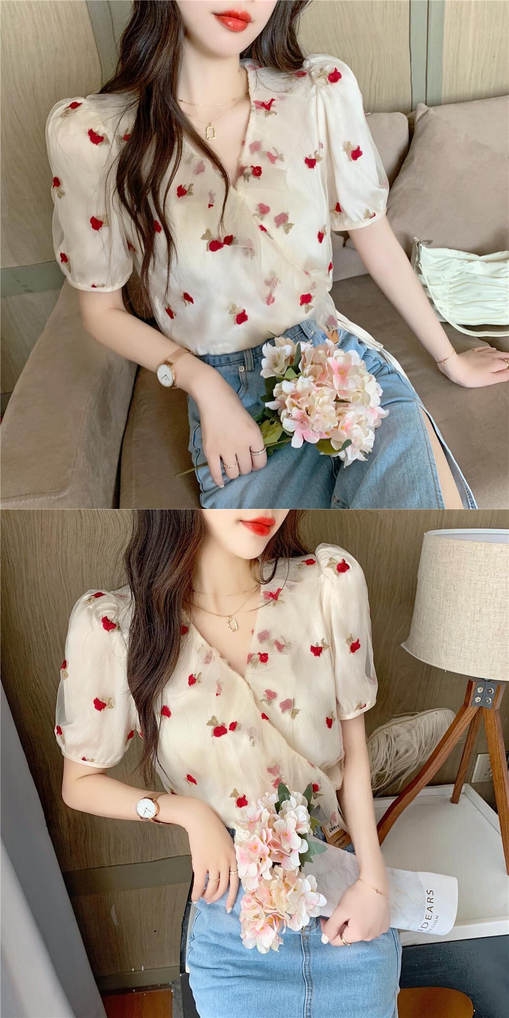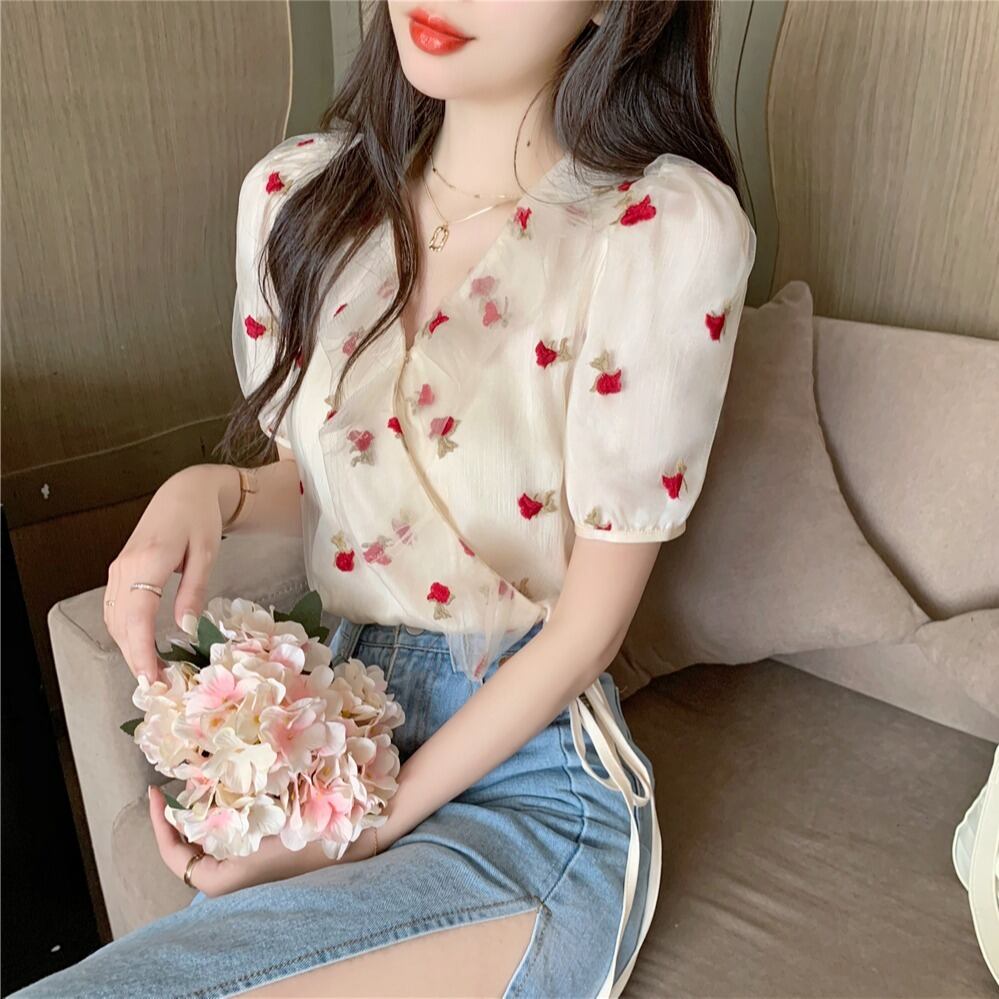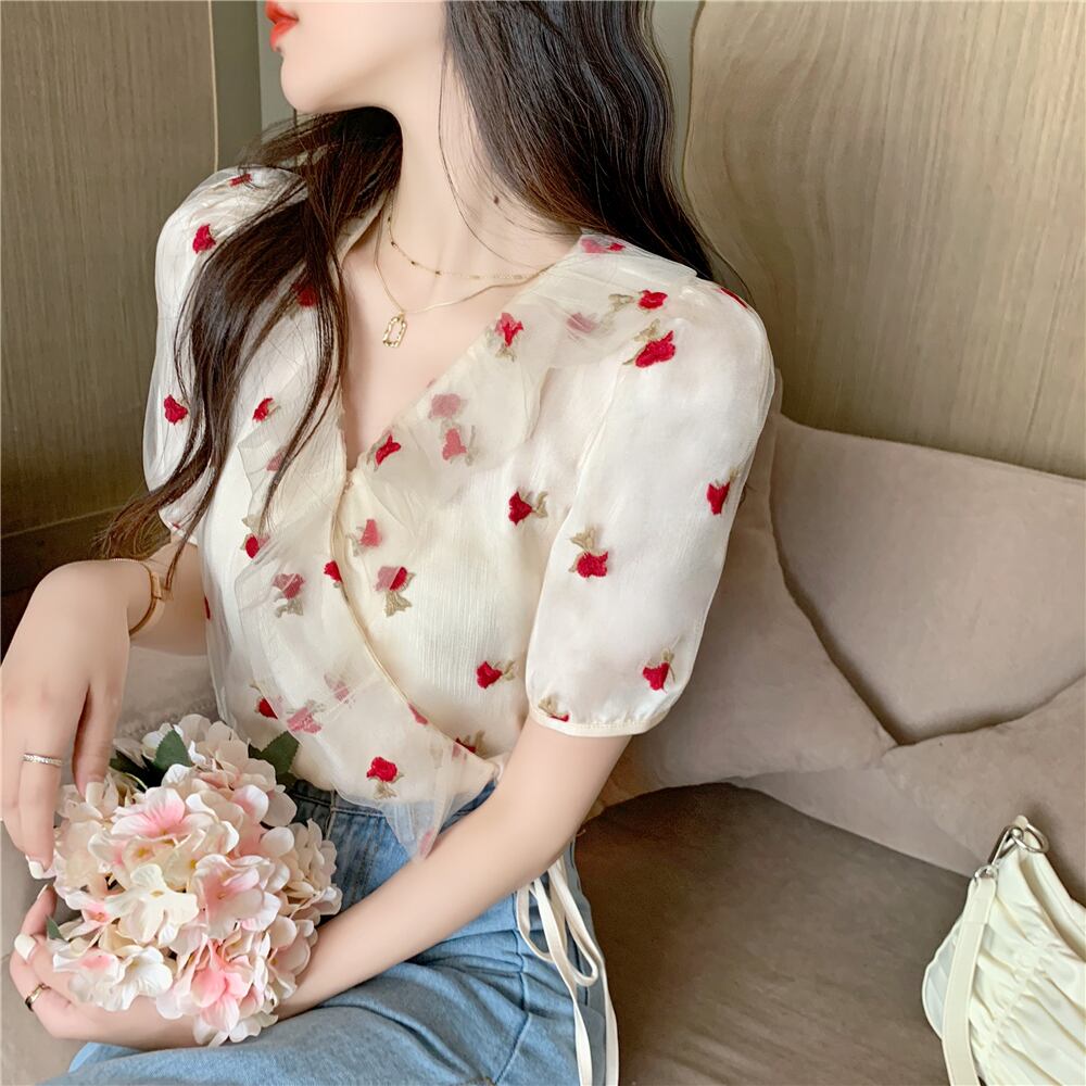 2021年夏新しいフレンチレトロ半袖シフォンシャツ女性デザインセンスニッチパフスリーブネットヤーントップ女性 サマー 夏物 yingd12968608433