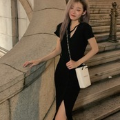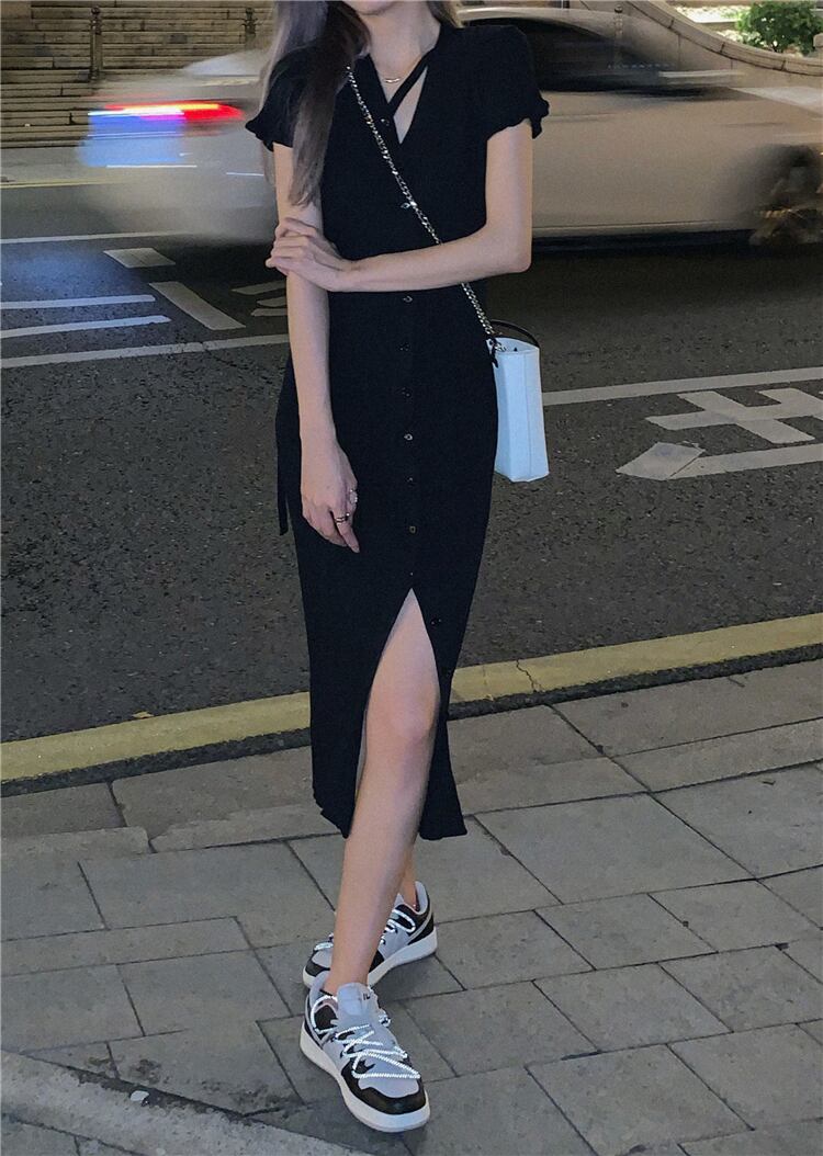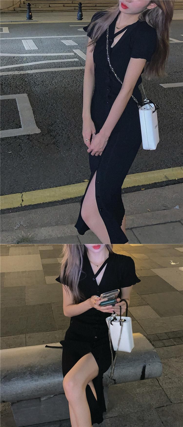 フランスのレトロシックなデザインのロングスカートのウエストは細く、スプリットVネックニットドレスの女性のハイエンドな感覚 yingd26157892881