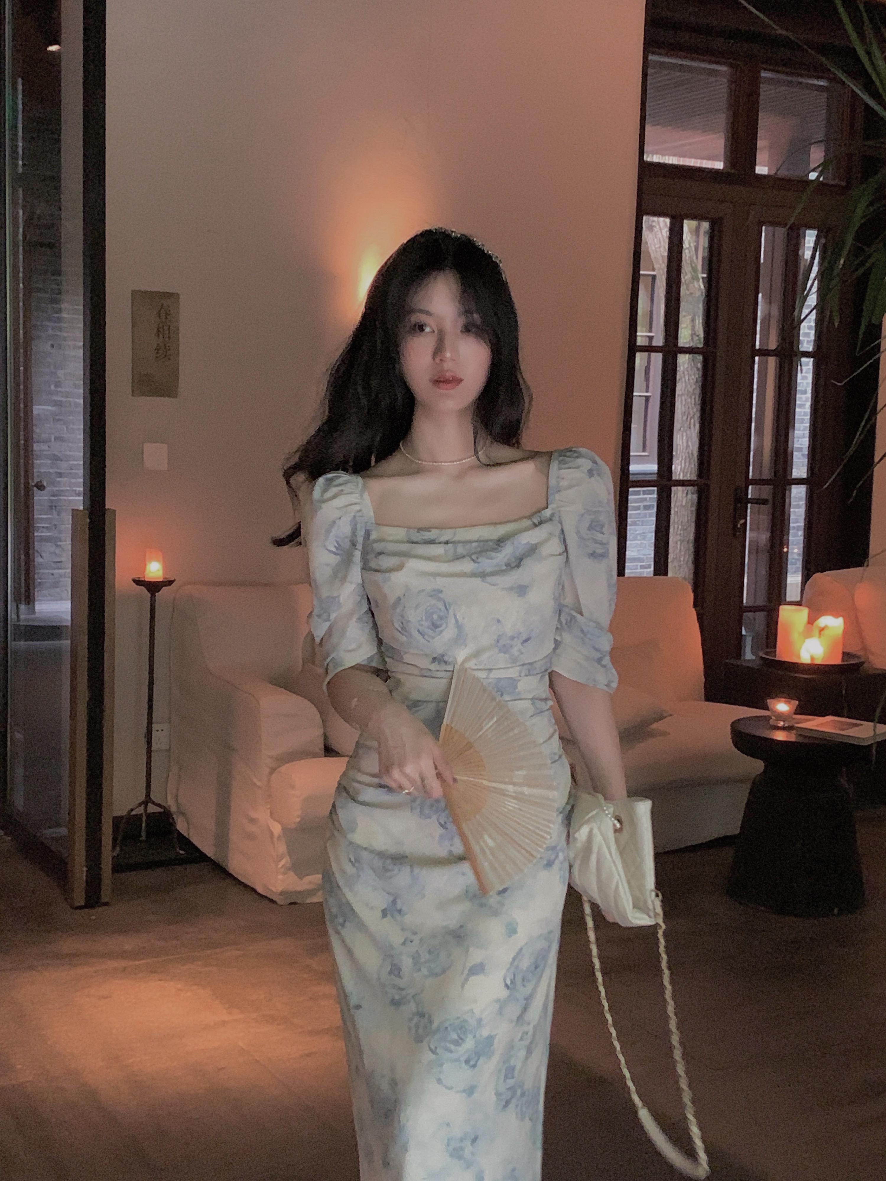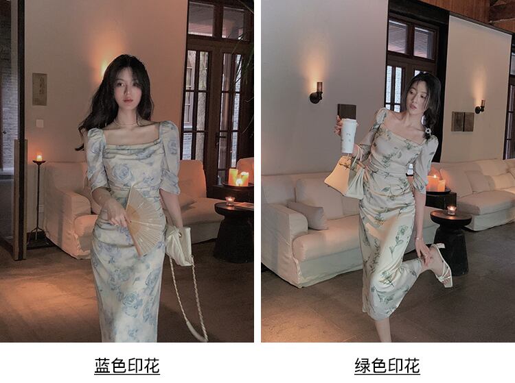 フランスのレトロなニッチな膝上ロングスカートウエストは薄くてセクシーなバッグヒップの女神ファンハイセンスフローラルドレス夏 サマー 夏物 花柄 yingd2823900010