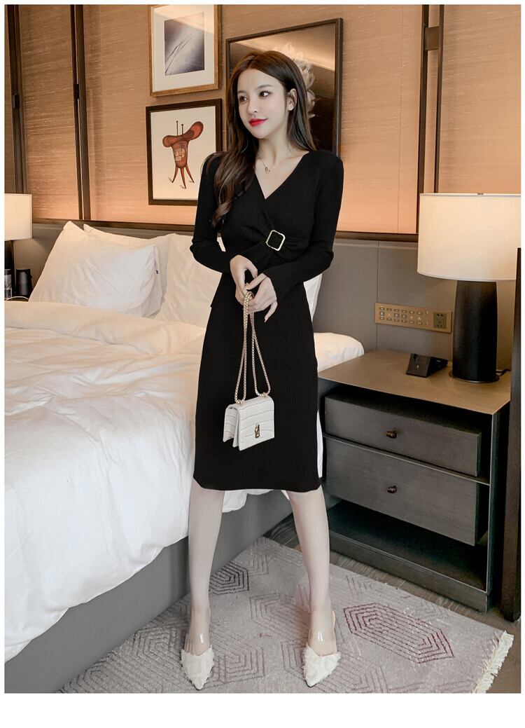 フランスのレトロなセクシーなタイトフィットヒップセータードレススリムスリミングVネックニットドレス女性の秋と冬 オータム 秋物 ウィンター 冬物 yingd66632852368