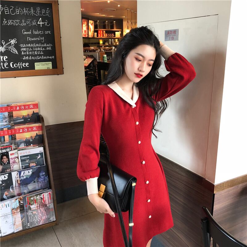 2020年秋新しい女性のフレンチスタイルのニッチなレトロな長袖のセータードレス、ウエストと薄い気質のニットドレス ロング オータム 秋物 yingd47763457271