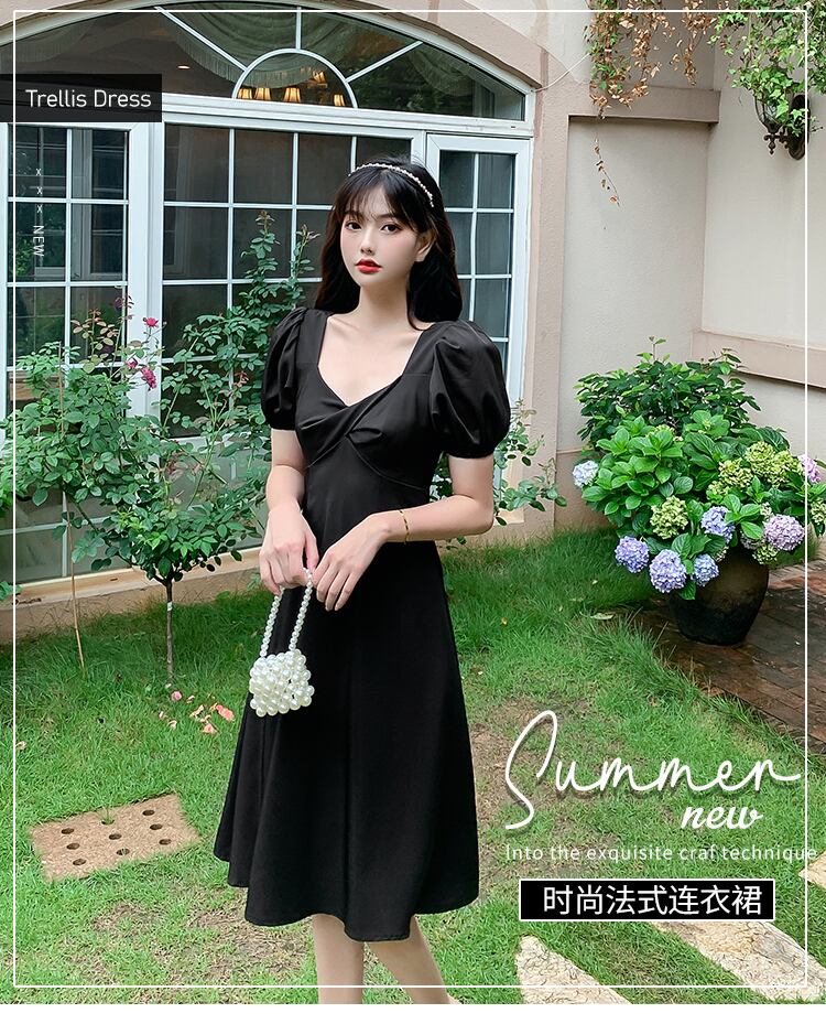 フレンチニッチレトロウエストスリミング気質ミドル丈スクエアネックパフスリーブ優しい風白ドレス女性夏 ホワイト サマー 夏物 スクウェア yingd23232050485